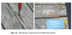 - Rötskador har efter 77 månader observerats på samtliga plankor impregnerade med Organowood. Huruvida rötskadorna beror på dålig impregnering med undermålig inträngning och/eller upptagning av kiselprodukt eller på dålig rötskyddseffekt eller på en kombination av de båda har inte med säkerhet kunnat fastställas.