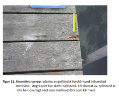 - Rötskador har även observerats på plankor av Sioo-behandlad gotländsk furukärnved, där angrepp uppkommit i kvarsittande splintved. Fläckvisa rötangrepp förekommer på robinia och ek.