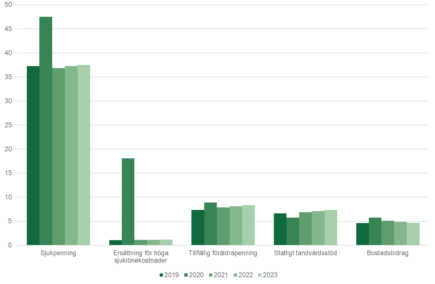 År 2019 uppgick utgifterna för socialförsäkringen till 218 miljarder kronor och under 2020 beräknas utgifterna att öka till 248 miljarder. Därefter förväntas utgifterna återgå till en nivå något över den för 2019 och hamna på 220 miljarder kronor år 2023. Utgifterna för 2020 är 19 miljarder kronor högre än beräknat i prognosen som publicerades i maj. Majoriteten av revideringen beror på ett flertal regeländringar inom socialförsäkring som införts på grund av pandemin.