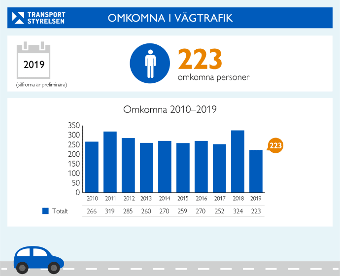 Under 2019 har antalet omkomna i vägtrafiken minskat med 101 personer jämfört med året innan. Det är personbilsolyckorna som har minskat mest, framförallt singelolyckor. Även motorcykelolyckorna har minskat påtagligt. Likaså har fordonskollisioner och fotgängarpåkörningar med dödlig utgång minskat.