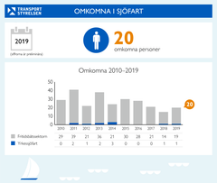 Antalet omkomna inom yrkessjöfarten fortsatt lågt. Inom yrkessjöfarten omkom en person 2019 i en arbetsplatsolycka, vilket är samma antal som under 2018. Totalt har 10 personer omkommit i svensk yrkessjöfart sedan 2010.