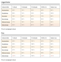 Anm: SBAB Booli Housing Price Index (HPI) uppdateras en gång i månaden och visar prisutvecklingen på bostadsmarknaden den senaste kalendermånaden, de tre senaste kalendermånaderna, de 12 senaste månaderna, sedan årsskiftet och sedan den senaste toppnoteringen. Indexet baseras på samtliga registrerade bostadsförsäljningar under den aktuella perioden. HPI beräknas som ett index med en hedonisk prismodell som förutom prisnoteringar använder information om bl.a. bostädernas storlek, taxeringsuppgifter, tomtstorlek, antal rum, våning, månadsavgift och geografisk placering, samt avgift till bostadsrättsföreningen. På så sätt tar indexet hänsyn till (kontrollerar för) att de bostäder som sålts vid olika tidpunkter kan skilja sig åt. För geografisk information används kommun- och stadsdelstillhörighet. Prisindexet går tillbaka till 2013. Indexet är uppdelat för lägenheter och villor och beräknas för 6 geografiskt skilda områden. Indexet finns tillgängligt i Boolis analysverktyg Booli Pro. Booli är en del av SBAB.