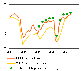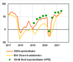 Diagram 1. SBAB Booli indikator (HPE) jämfört med SEB:s och Erik Olssons