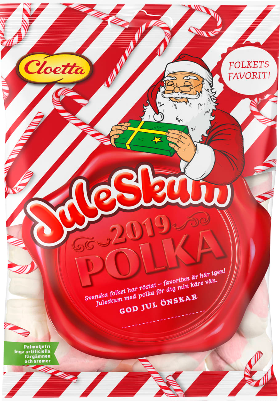 Juleskum Polka innehåller fluffiga skumtomtar med smak av frisk och julig polka. Precis som Juleskum Original är Juleskum Polka fri från palmolja och tillverkas i Cloettas fabrik i Ljungsbro utanför Linköping.
