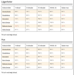 Anm: SBAB Booli Housing Price Index (HPI) uppdateras en gång i månaden och visar prisutvecklingen på bostadsmarknaden den senaste kalendermånaden, de tre senaste kalendermånaderna, de 12 senaste månaderna, sedan årsskiftet och sedan den senaste toppnoteringen. Indexet baseras på samtliga på Booli registrerade bostadsförsäljningar under den aktuella perioden. HPI beräknas som ett index med en hedonisk prismodell som förutom prisnoteringar använder information om bl.a. bostädernas storlek, taxeringsuppgifter, tomtstorlek, antal rum, våning, månadsavgift och geografisk placering, samt avgift till bostadsrättsföreningen. På så sätt tar indexet hänsyn till (kontrollerar för) att de bostäder som sålts vid olika tidpunkter kan skilja sig åt. För geografisk information används kommun- och stadsdelstillhörighet. Prisindexet går tillbaka till 2013. Indexet är uppdelat för lägenheter och villor och beräknas för 6 geografiskt skilda områden. Indexet finns tillgängligt i Boolis analysverktyg Booli Pro. Booli är en del av SBAB.