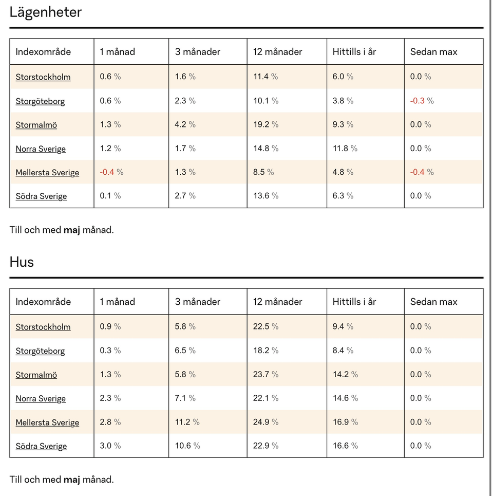 Under maj steg lägenhetspriserna som mest i Stormalmö (1,3 procent), tätt följt av Norra Sverige (1,2 procent). I Storstockholm och Storgöteborg ökade lägenhetspriserna med 0,6 procent. I Mellersta Sverige föll lägenhetspriserna med 0,4 procent.