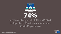 90 % av de tillfrågade svenskarna anser att EU bör ha fler befogenheter att hantera kriser som covid-19-pandemin. Detta är en ökning med fyra procentenheter jämfört med november/december 2020. På EU-nivå är den motsvarande andelen 74 %.