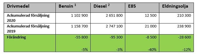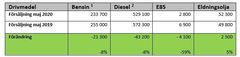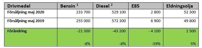 Försäljningen av drivmedel har påverkats av reserestriktioner i Sverige på grund av Covid-19. Logistikkedjor och leveranser har fungerat och drivmedelsstationerna har under hela pandemin varit öppna i Sverige. Nedgången i bensinförsäljningen med 8 % jämfört med maj 2019 är mindre än i april (16 %), samtidigt är nedgången i dieselvolymerna med 8 % något större än i april (5 %).
