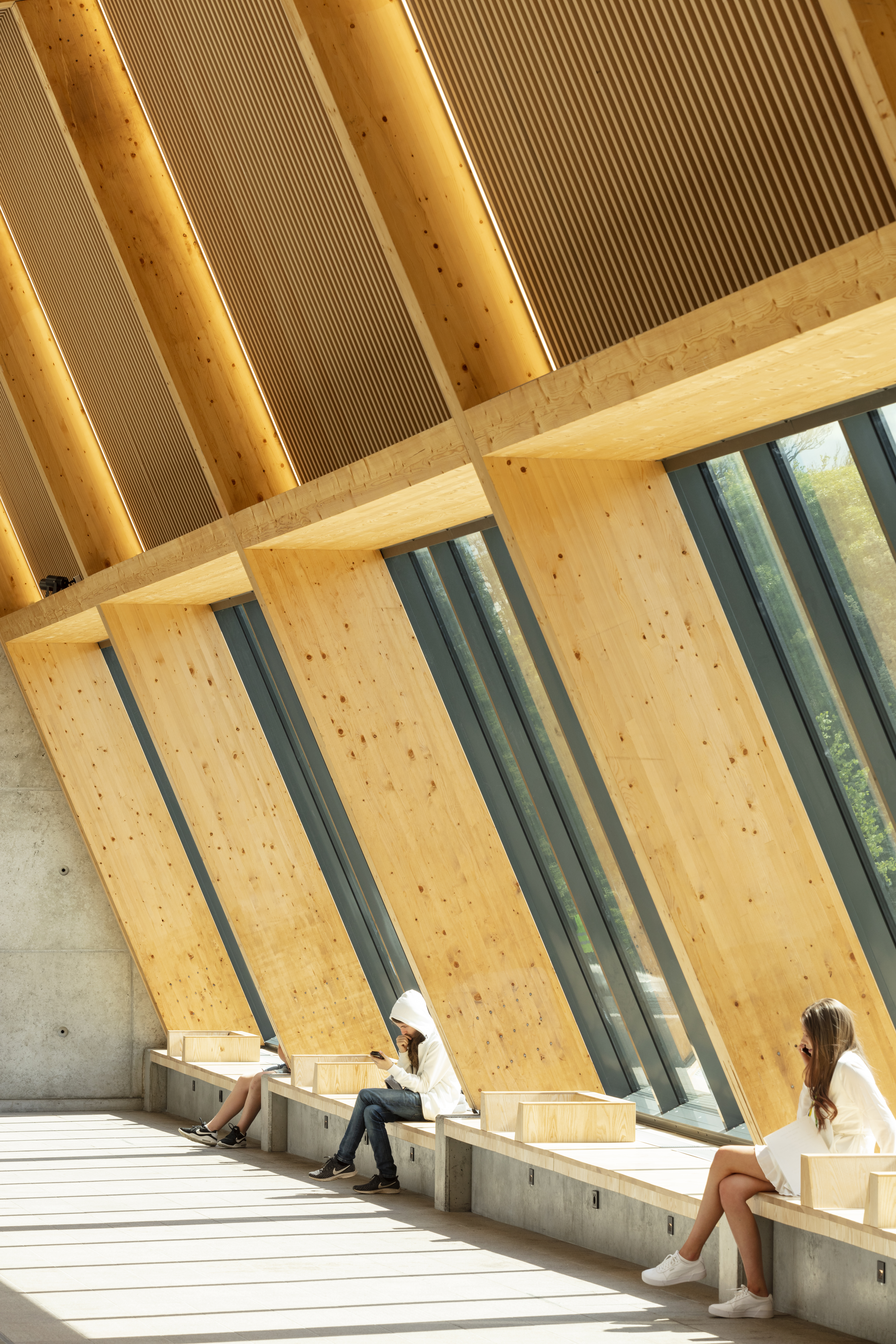 Den frilagda limträstommen beskriver tydligt byggnadens skurna vinklar även invändigt och skapar samtidigt ett luftigt rum, lätt att trivas i. Träkonstruktionens upprepning bildar intima rum i rummet. Resecentrumets funktioner är alla skickligt integrerade i arkitekturen. Både väntsalen och platsen utanför präglas av hög kvalitet och omsorg om detaljer. Avsaknad av reklam och plottrig skyltning bidrar till ett visuellt lugn.