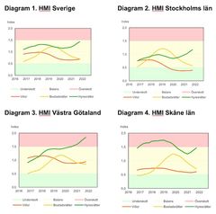 Anm. SBAB Booli Housing Market Index (HMI) är ett bostadsmarknadsindex som speglar läget i nyproduktionen av olika bostadstyper i alla de områden i Sverige där det finns tillräcklig försäljningsstatistik. Indexet mäter hur utbudet av nya bostäder och priserna på dessa förhåller sig till efterfrågan med hänsyn tagen till bland annat hushållens köpkraft på respektive ort (inkomstfördelningen), preferenser för olika boendeformer och flyttmönster. Ett index inom spannet 0,5–1,5 tolkas som en nyproduktionsmarknad som i stort är i balans. Ett index som överstiger 1,5 tolkas som att nyproduktionsvolymen är tydligt större än hushållens efterfrågan. Ett index som understiger 0,5 innebär att utbudet av nya bostäder är tydligt mindre än hushållens efterfrågan. Indexet kan ändras bakåt i tiden i det fall historiska data, bland annat från SCB, ändras. I bilagan finns indexet beräknat för alla de områden där tillräcklig pris/hyresstatistik finns och ett urval av diagram för olika områden.