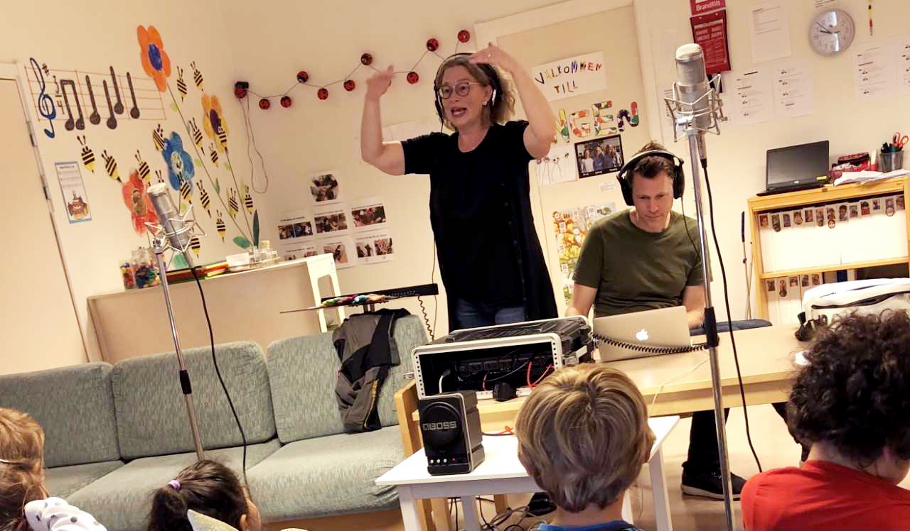 Sofie Tubbin, musikpedagog, Erik Lund musikproducent, Marie Andersson, förskollärare och biosfärambassadör samt personal och barn från Öxnehaga förskoleområde.
