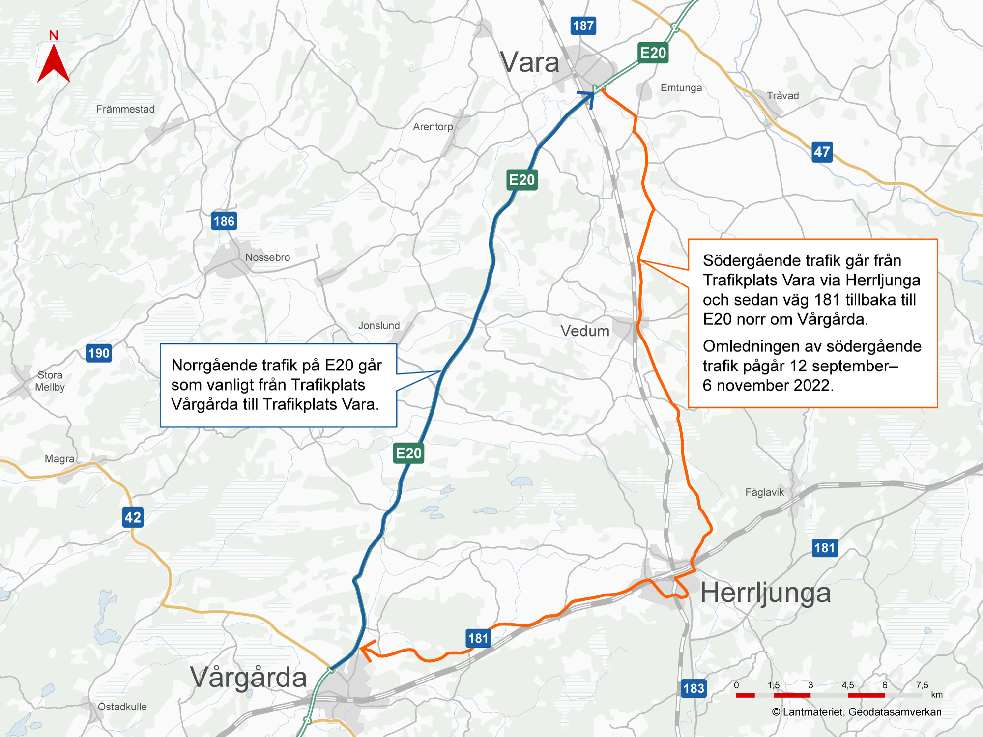 Södergående trafik E20 från Vara till Vårgårda leds om via Herrljunga 12/9–6/11