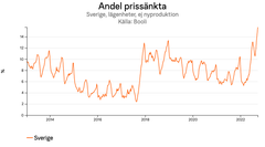 Under de senaste fyra veckorna prissänktes 15,5 procent av alla hus och lägenheter på marknaden. Att en bostad prissänks innebär att utgångspriset sänkts för att köpare och säljare ska mötas. Det är en hög andel av bostäderna på marknaden och för lägenheter är andelen prissänkta objekt uppe på rekordnivåer.
