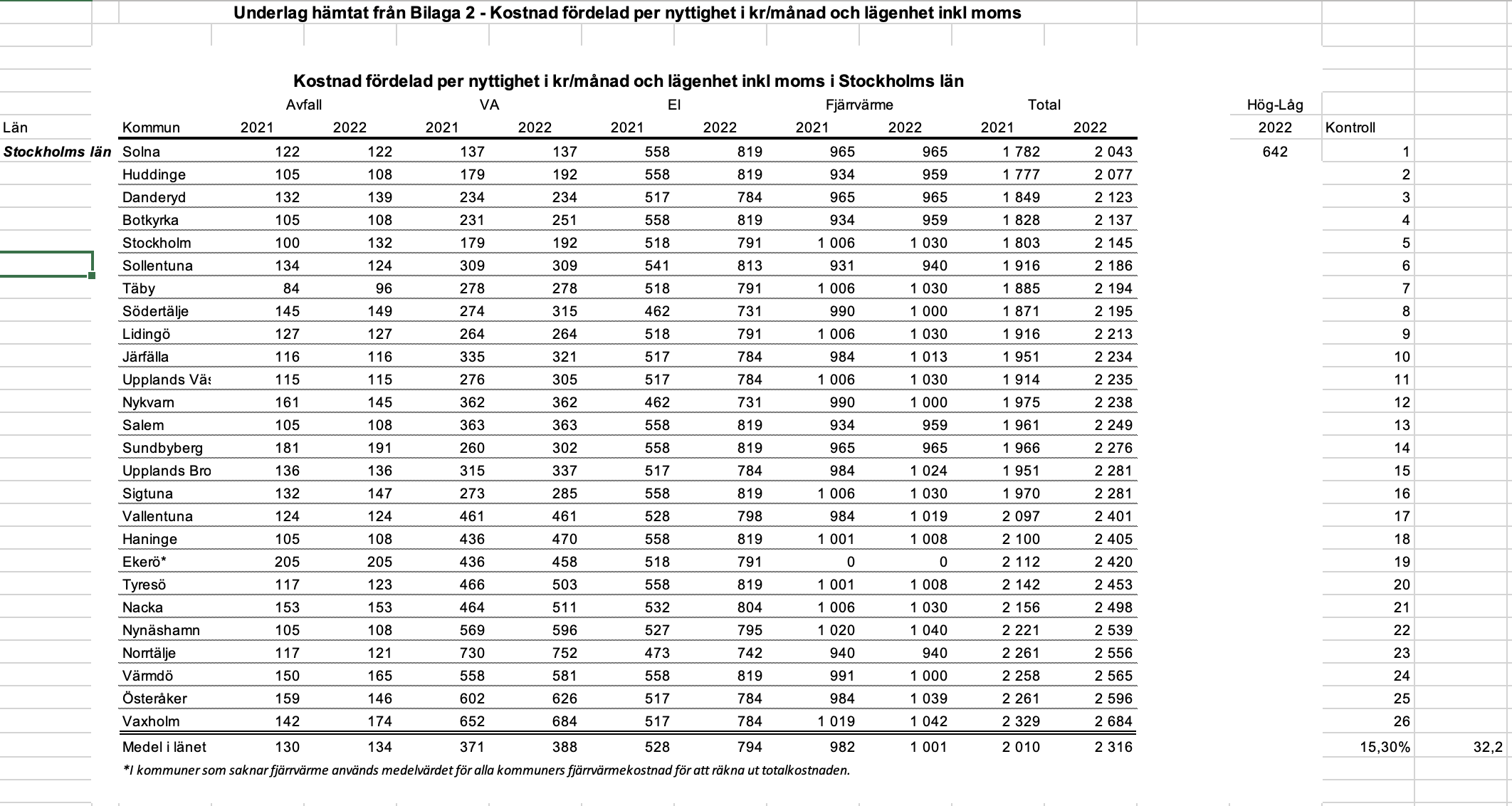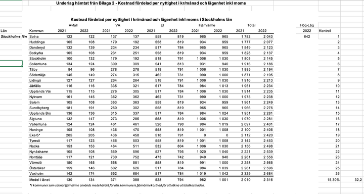 Skillnaden är alltså stor mellan Sveriges kommuner. Tabellen nedan visar kostnaden per lägenhet och månad för fjärrvärme, el, vatten och avlopp (VA) samt avfall i Stockholms läns samtliga kommuner.