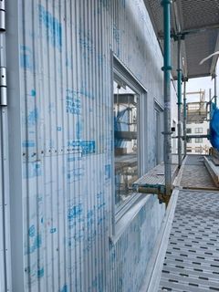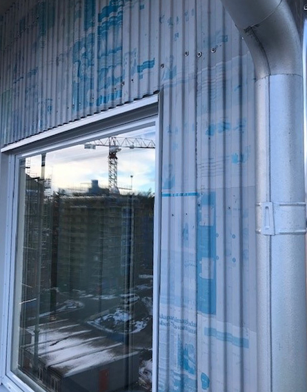 Tidningsplåten har skickats till en plåtslagare i Malmö som behandlat, pressat och format den i en sinusform. Därefter har den monterats på 500 kvadratmeter av den stora fasaden.
