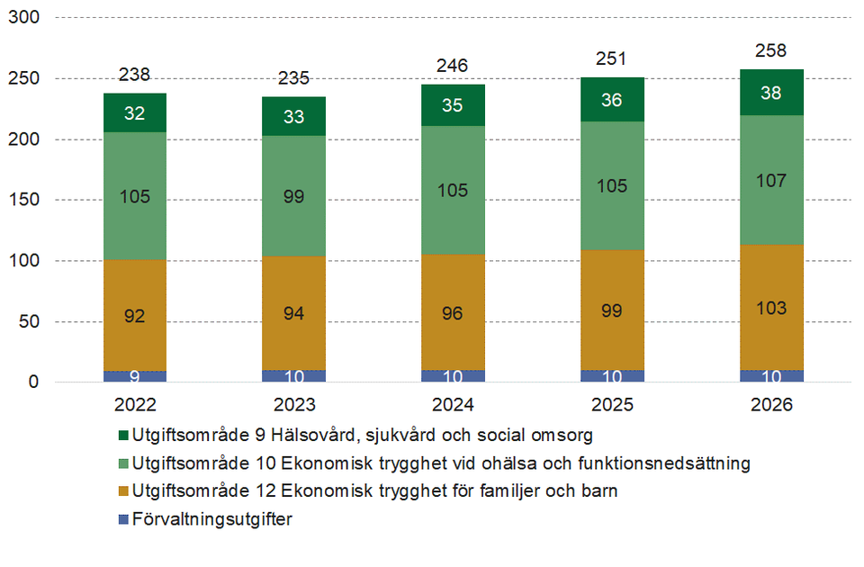 Under 2025 väntas utgifterna för socialförsäkringen öka med ungefär 2 miljarder och landa på totalt 249 miljarder kronor, vilket motsvarar 17,5 procent av statens samlade utgifter. Under kommande år väntas ökningen bli större, cirka 10 miljarder år 2026, främst på grund av regeländringar inom statligt tandvårdsstöd, höjd pensionsålder och stigande löner. Det visar Försäkringskassans utgiftsprognos som idag skickas till regeringen.