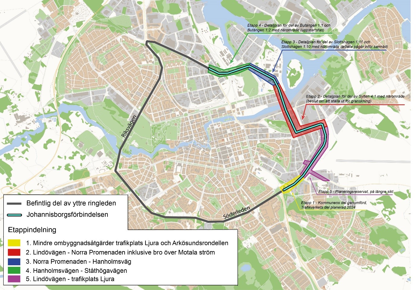 När det gäller övriga etapper av Johannisborgsförbindelsen har planarbetet för etapp 3 inom Slottshagen påbörjats och samråd planeras under hösten 2023, med planerad byggstart under 2027. Etapp 4 inom Butängen, inklusive bro över järnvägsområdet, har projektstart under hösten 2023 och planerad byggstart under 2028