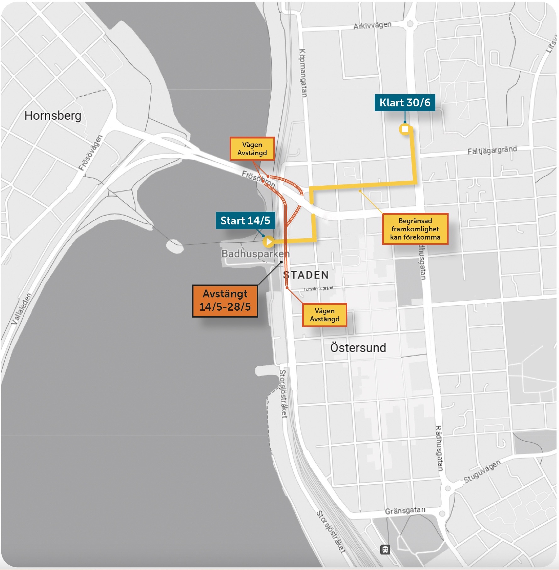 Strandgatan stängs av för trafik från Frösöbron till Törnstens gränd under kvällen söndag 14 maj och planeras vara avstängd till och med söndag 28 maj. Cykelbanan längs med Strandgatan kommer vara öppen och det kommer vara möjligt att korsa Strandgatan från Badhusparken till Samuel Permans gata.