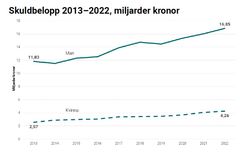 Vid slutet av 2022 hade antalet äldre med skulder hos Kronofogden ökat med 460 personer jämfört med föregående år. Vid årsskiftet var det totala skuldbeloppet för de äldre cirka 21 miljarder kronor vilket är en ökning med drygt en miljard kronor jämfört med 2021. Av det bestod nästan 10 miljarder kronor av räntor och avgifter, knappt hälften av det totala skuldbeloppet.