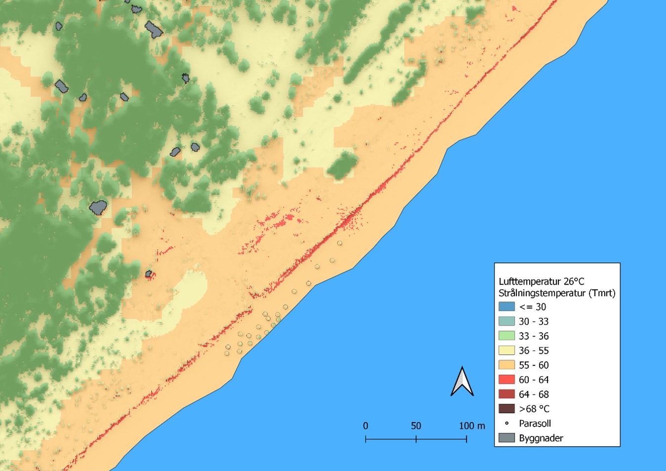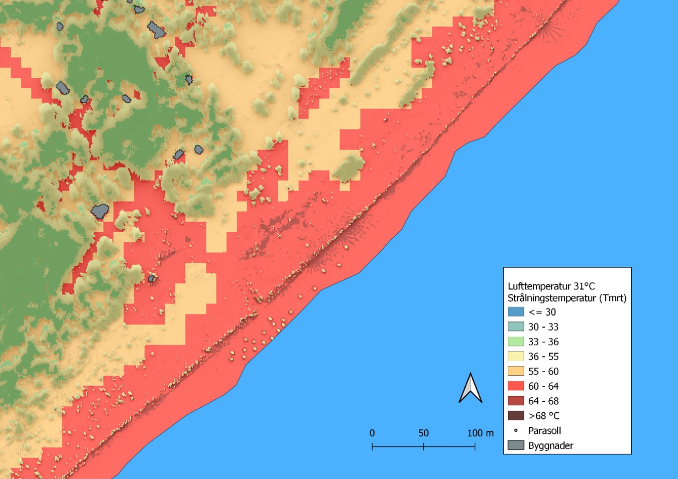 - När lufttemperaturen är på 26 grader (°C) är delar av stranden är röd med strålningstemperaturer på över 60 grader vilket innebär en höjd mortalitetsrisk på 10 procent för den nämnda målgruppen, och en höjd mortalitetsrisk på 5 procent även för människor mellan 45–79 år.