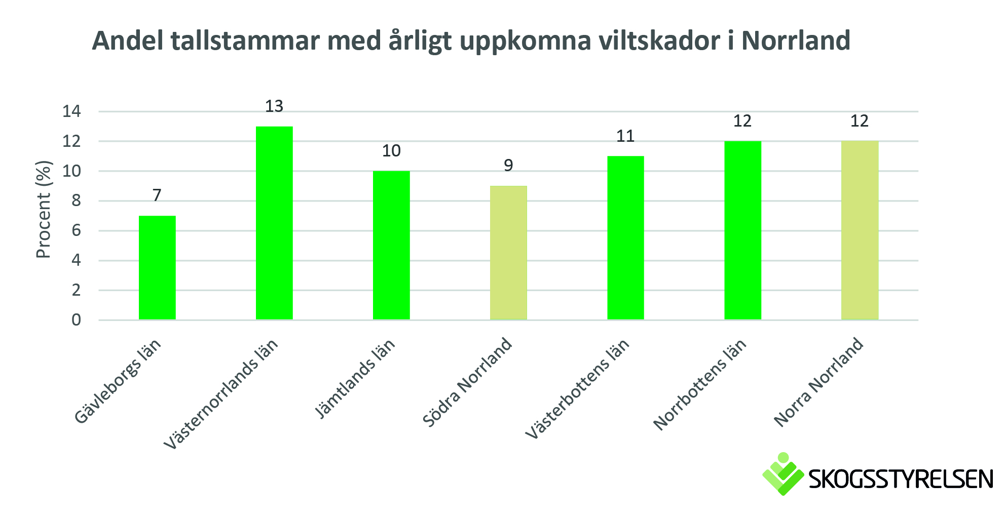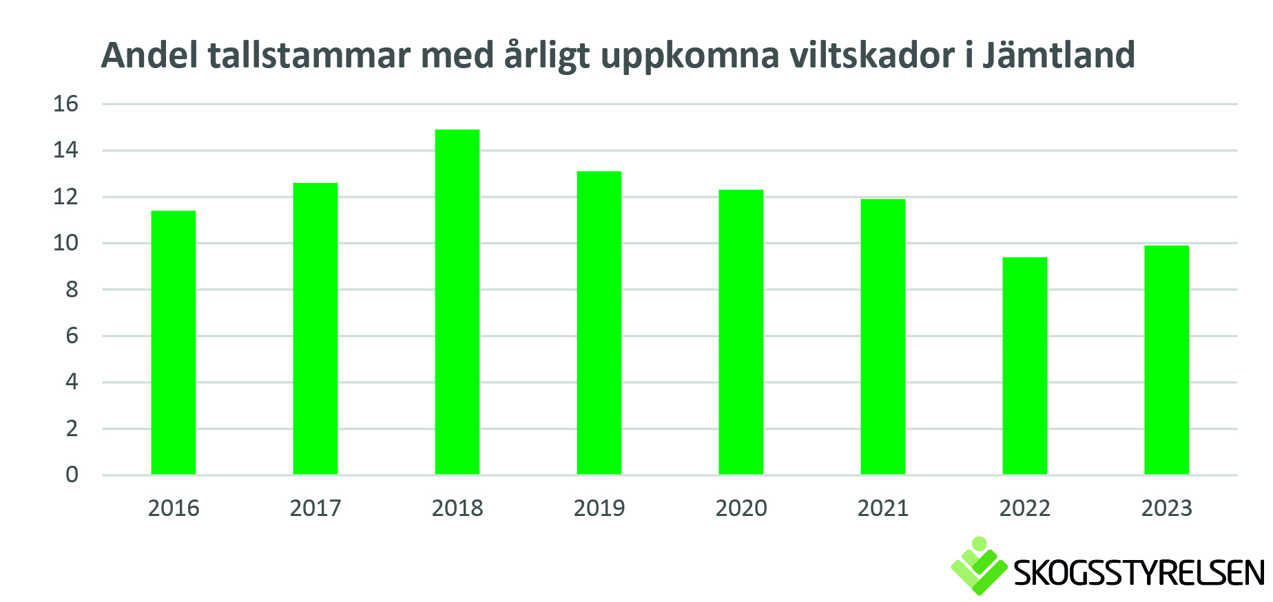 Resultatet för Jämtland Härjedalens län är en försämring med en procentenhet jämfört med inventeringen förra året men det är ändå betydligt bättre än bottenresultatet från 2018 då skadorna låg på 15 procent. Sedan dess syns en svagt nedåtgående trend över tid i Jämtland. (Se utvecklingen nationellt och lokalt i tabellerna nedan!)
