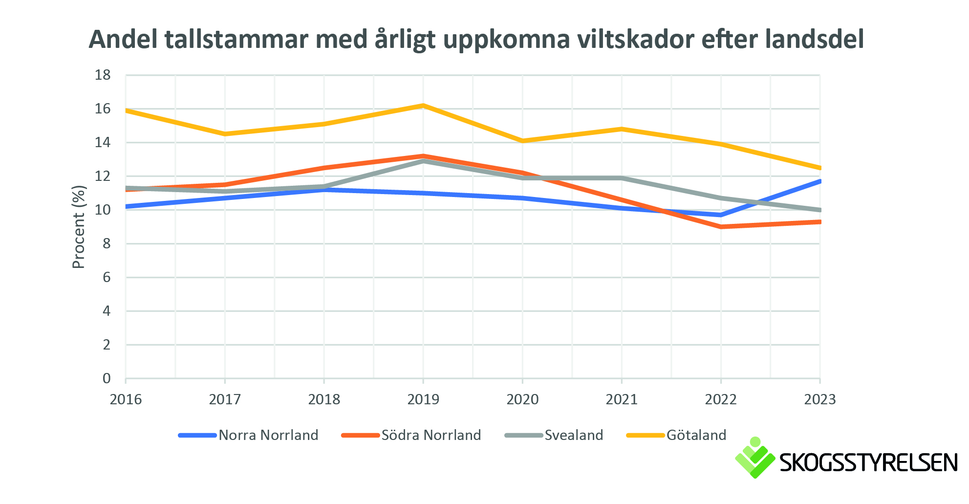Utvecklingen i Jämtland och Västernorrland visar ett högt men liknande resultat som tidigare år med 10 respektive 13 procent i årets inventering. I Norrbotten och Västerbotten ser vi en ökning av årsskadad ungtall till 12 respektive 11 procent. På nationell nivå ligger skadenivån på 11 procent i årets inventering. Det innebär en liten nedgång sedan det sämsta resultatet 2019 då nivån låg på 13 procent, men är samtidigt en uppgång med en procentenhet sedan 2022. Skadenivån har sedan 2016 pendlat runt drygt 10 procent.