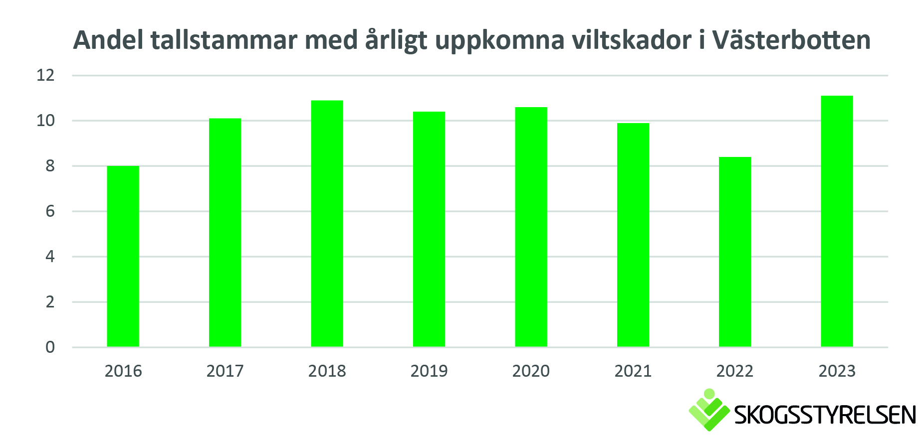 11 procent av ungtallarna i Västerbottens län har skadats av viltbete från älg och andra hjortdjur under senaste året. Det visar en inventering som Skogsstyrelsen gjort. Det är långt över målet på maximalt fem procent. Skadorna kan i värsta fall döda träden och orsakar varje år tillväxtförluster nationellt motsvarande miljardbelopp.