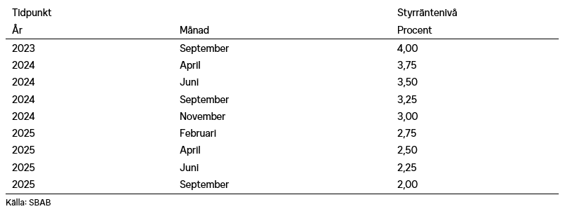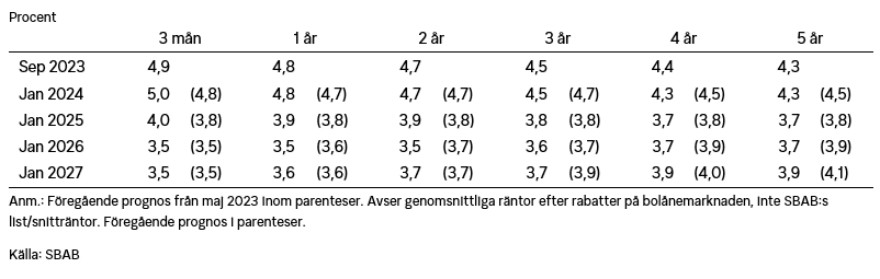 Utifrån förväntningen att Riksbanken höjer styrräntan med ytterligare 0,25 procentenheter i september och att det blir den sista höjningen, bedöms den rörliga snitträntan toppa på drygt 5 procent mot slutet av året. Den väntas sedan sjunka till drygt 4 procent till slutet av nästa år.
