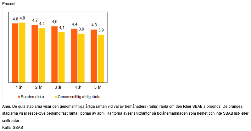 Utifrån SBAB:s prognos över bolåneräntor med olika bindningstid, förefaller rörlig ränta som binds om vart tredje månad under ett år och ett års bindningstid just nu vara i stort sett likvärdiga alternativ, sett till den förväntande räntekostnaden.