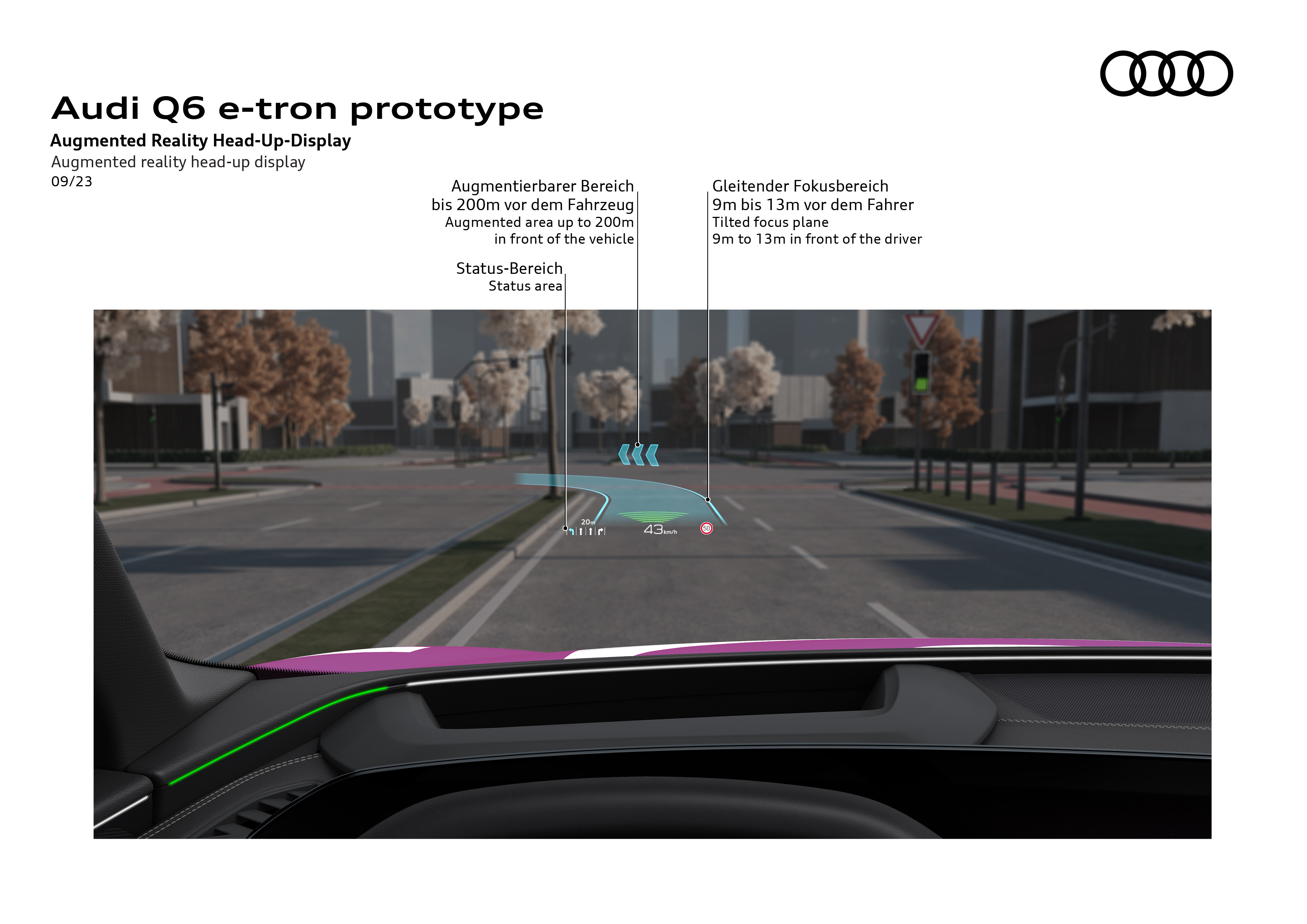 Med tillvalet Augmented Reality Head-up Display tar Audi ett stort steg inom visningstekniken. Den projicerar en stor vinklad bildyta över vindrutan mot föraren och visar relevant information som hastighet, vägmärken, körhjälps- och navigationssymboler. Bildytan är lutat framåt för att förstärka augmented reality-intrycket. Det mänskliga ögats fokus följer med. Det skapar ett intryck av att de visade symbolerna svävar på upp till 200 meters avstånd och interagerar direkt med omgivningen. Indikeringarna kan snabbt läsas av utan att distrahera föraren. Särskilt vid dålig sikt är de till stor hjälp. Ur ett förarperspektiv motsvarar siktfönstret för Augmented Reality-symbolerna en diagonal på ca 88 tum.