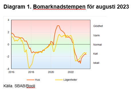 Diagram 1-3 med Bomarknadstempen för augusti 2023 som helhet samt för lägenheter respektive hus finner du i bifogat pressmeddelande.