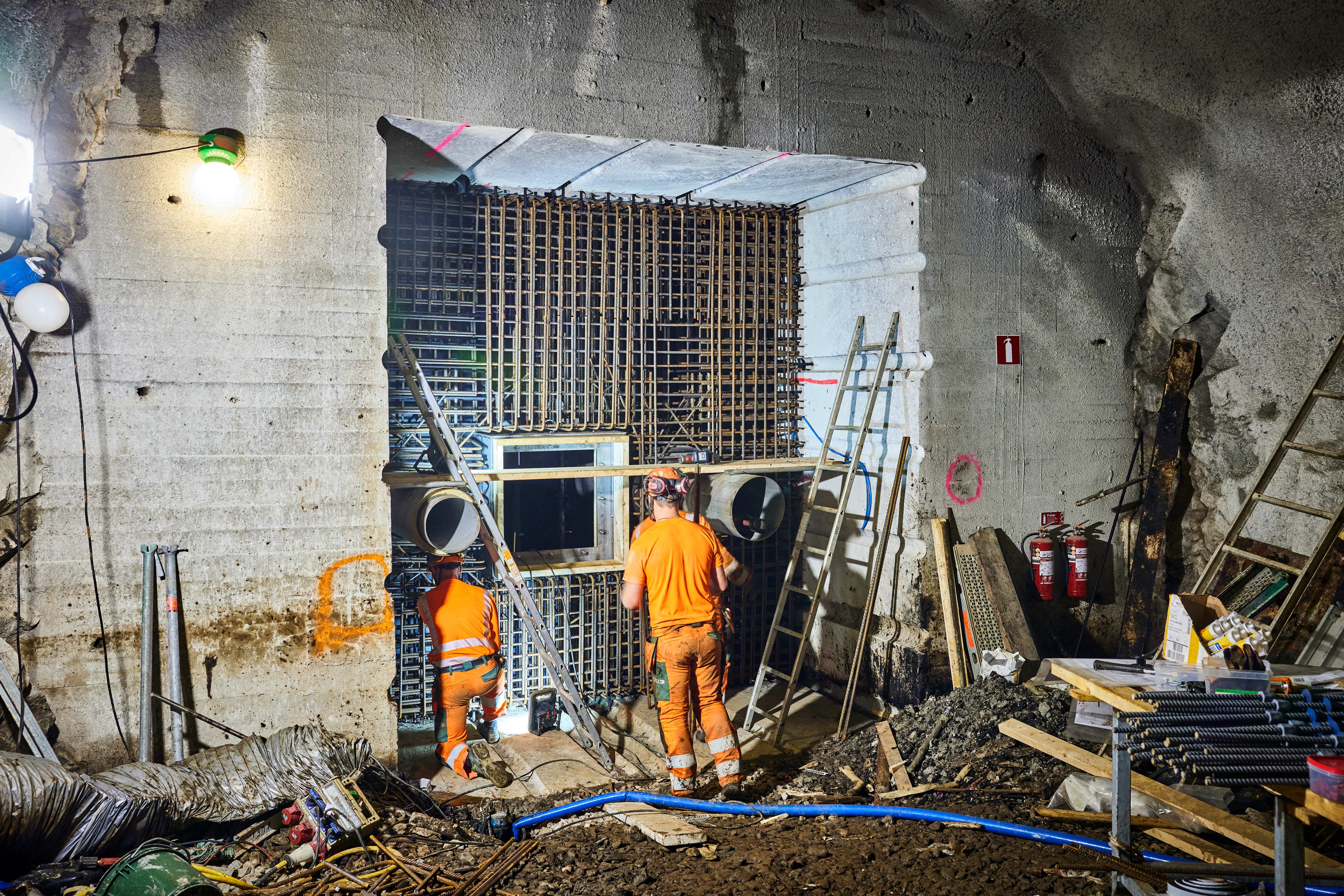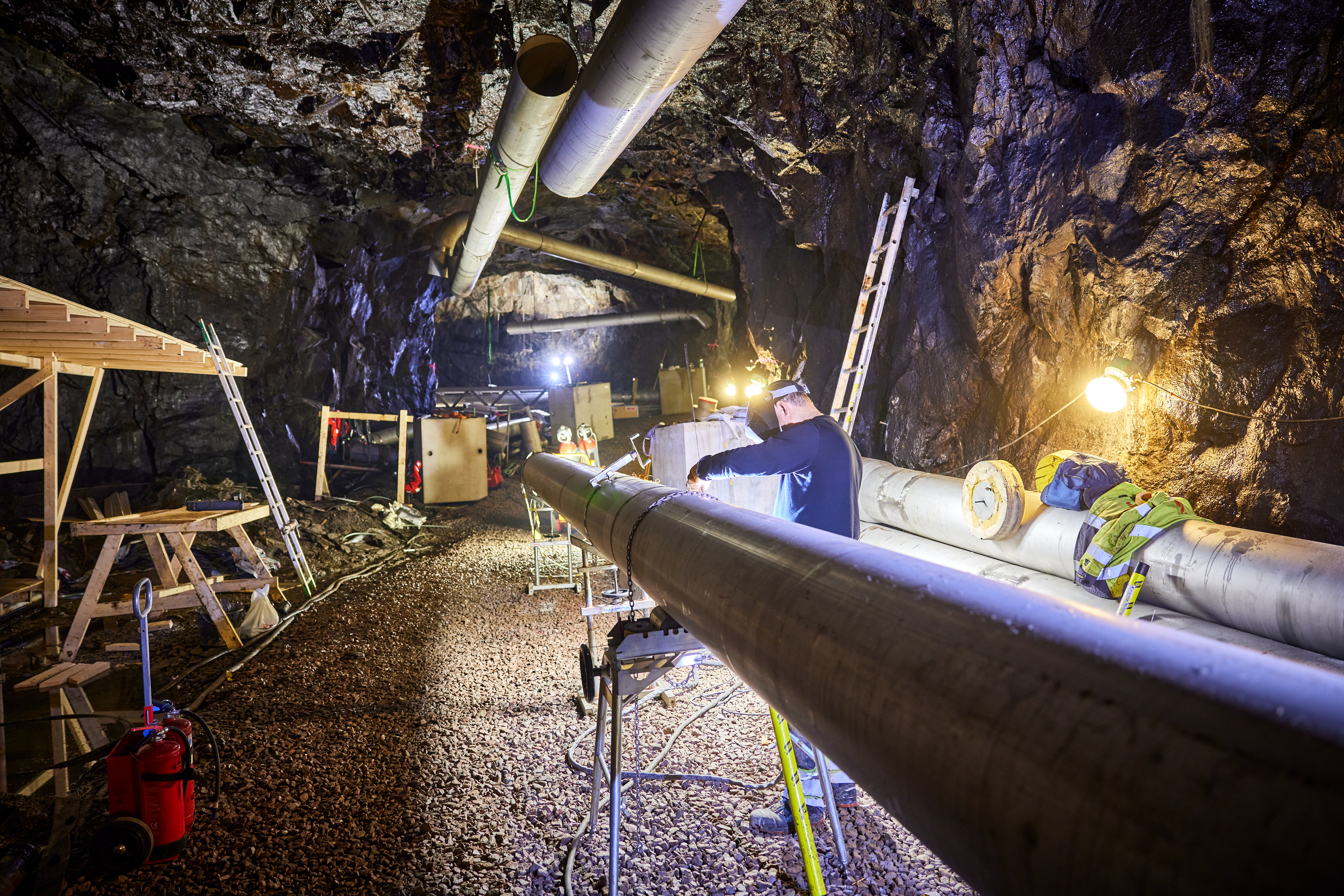 Oljesaneringen, som blev mer omfattande än planerat, var klar i maj 2023. Därefter kunde rör och andra driftkomponenter installeras i de tre skepp som bergrummet består av. De senaste veckorna har ingångarna till de tre skeppen gjutits igen, ett efter ett. Bergrummet är återigen tillslutet och förseglat. Just nu installeras de rör och pumpar som finns utanför de tre igenpluggade ingångarna.