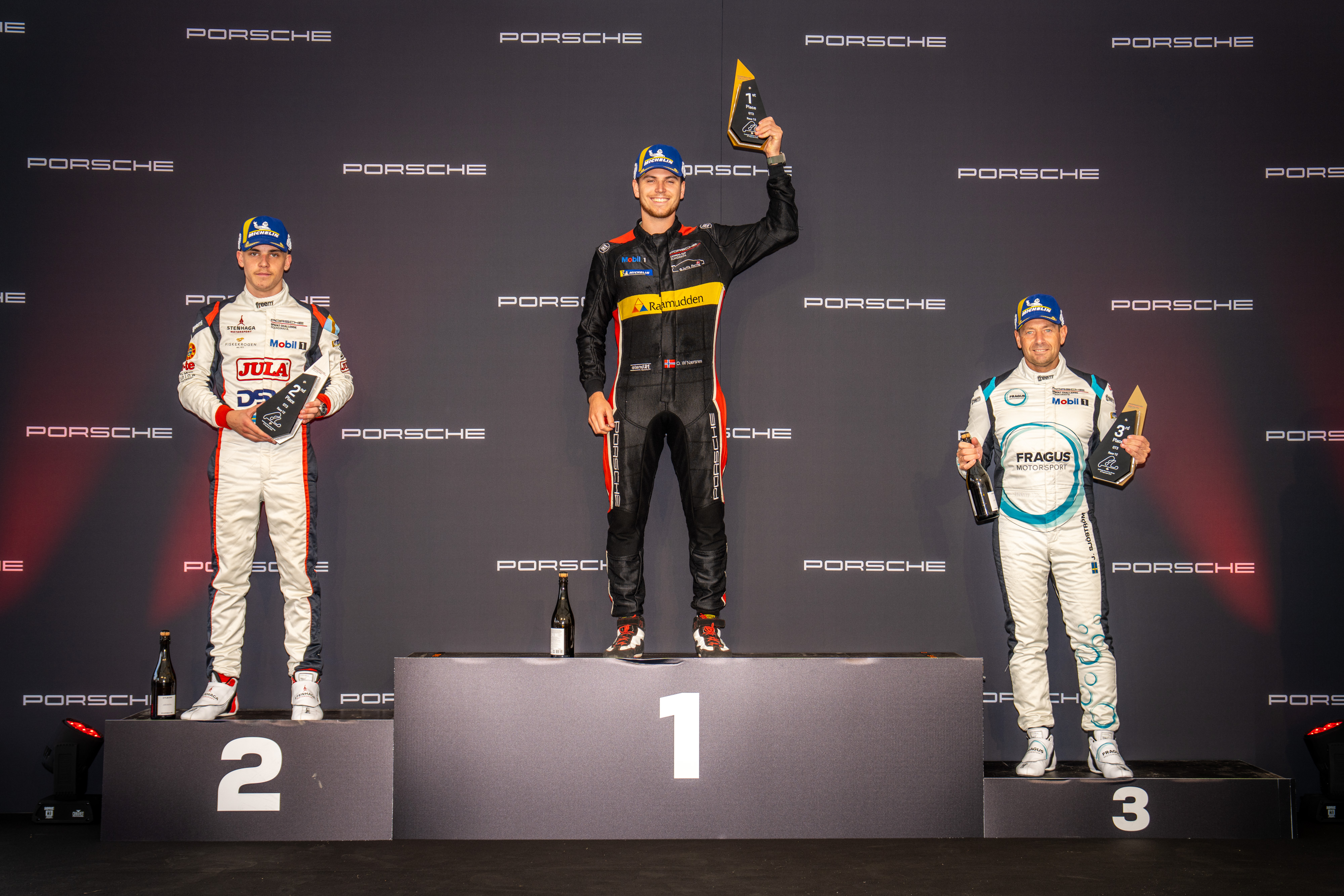 I supportklassen Porsche Sprint Challenge sprack redan klare mästaren William Siverholms segersvit. Efter att ha vunnit det inledande racet (hans elfte raka triumf den här säsongen) fick han ge sig för norske inhopparen Ole William Nærsnes i det andra.