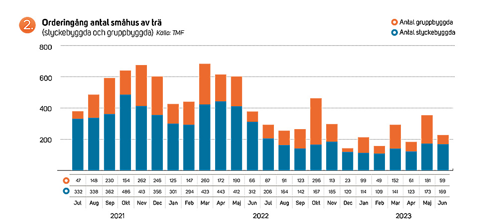 För flerbostadshus har orderingången minskat med 41 procent för första halvåret 2023 (jämfört med motsvarande period 2022)) och totalt levererades 1 749 (2 872) lägenheter, en minskning med 39 procent. Prognosen för påbörjade lägenheter i flerbostadshus – baserad på antal kontrakterade leveranser tolv månader framåt (juli 2023-juni 2024) – visar att totalt 1 803 lägenheter kommer att levereras.