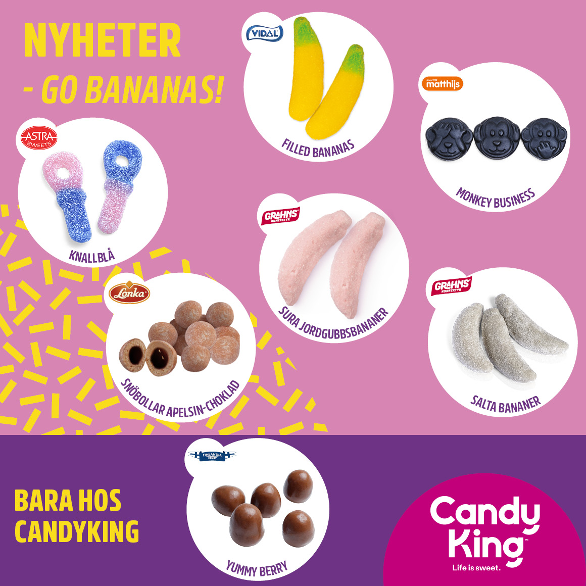 - Sura Jordgubbsbananer – Och såklart ska vi även ha sura bananer! Även dessa har det funnits en önskan efter, så nu kör vi banantema.