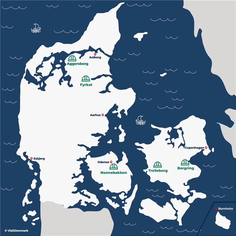 Fästningen Fyrkat nära Hobro i norra Jylland byggdes runt 980-talet. Ännu idag erbjuder vallen en imponerande utsikt. Norr om fästningen indikerar en kyrkogård att Fyrkat beboddes av både män, kvinnor och barn - dessutom tyder det på att denna fästning kan ha byggts för att upprätthålla kunglig makt. Utanför fästningen kan du idag hitta en rekonstruktion av ett av de största husen. Huset är 28,5 meter långt och byggt av ek.