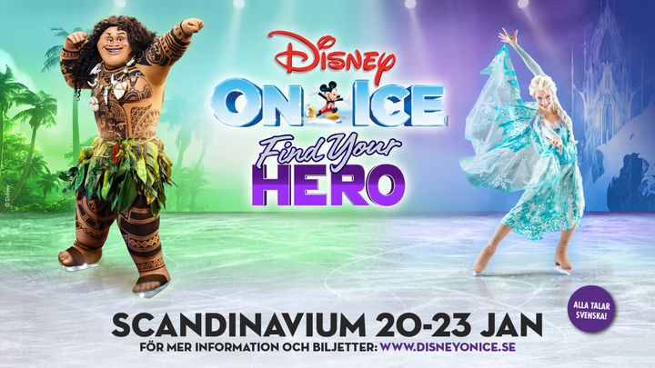 Disney On Ice presenterar Find Your Hero, ett äventyr fyllt med berättelser om hjältemod med dina favoritsagor från Disney. Följ med orädda Vaiana och halvguden Maui på en actionfylld resa för att återta Te Fitis stulna hjärta. Res tillsammans med de kungliga systrarna Anna och Elsa i deras strävan efter att skydda kungariket. Dyk ner i havet med Sebastian och känn styrkan av sann kärlek med Den Lilla Sjöjungfrun. Bli tilltrasslad med Rapunzel när hon vågar utforska världen utanför sin egen. Och var där när Belle modigt tämjer det fruktansvärda Odjuret. Upptäck att mod, beslutsamhet och kärlek alla är en del av hjälten i dig!