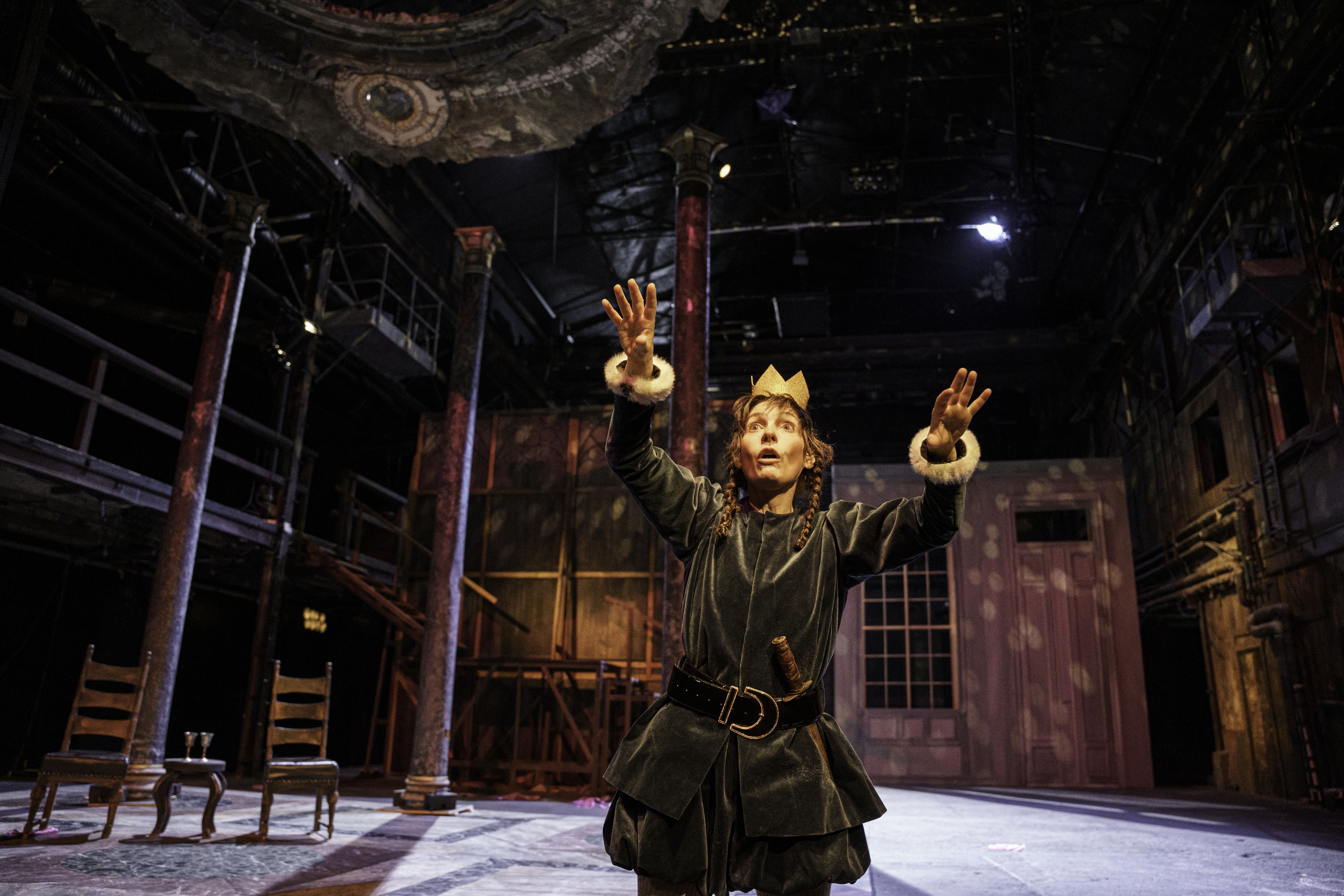 Orionteatern har omvandlats till ett stort, ödsligt slott med marmorgolv och pelare som sträcker sig upp i takkupolen. Här ger en ensemble av mimare och skådespelare liv åt Barbro Lindgrens och Anna Höglunds komprimerade Hamlet, med endast en handfull repliker.