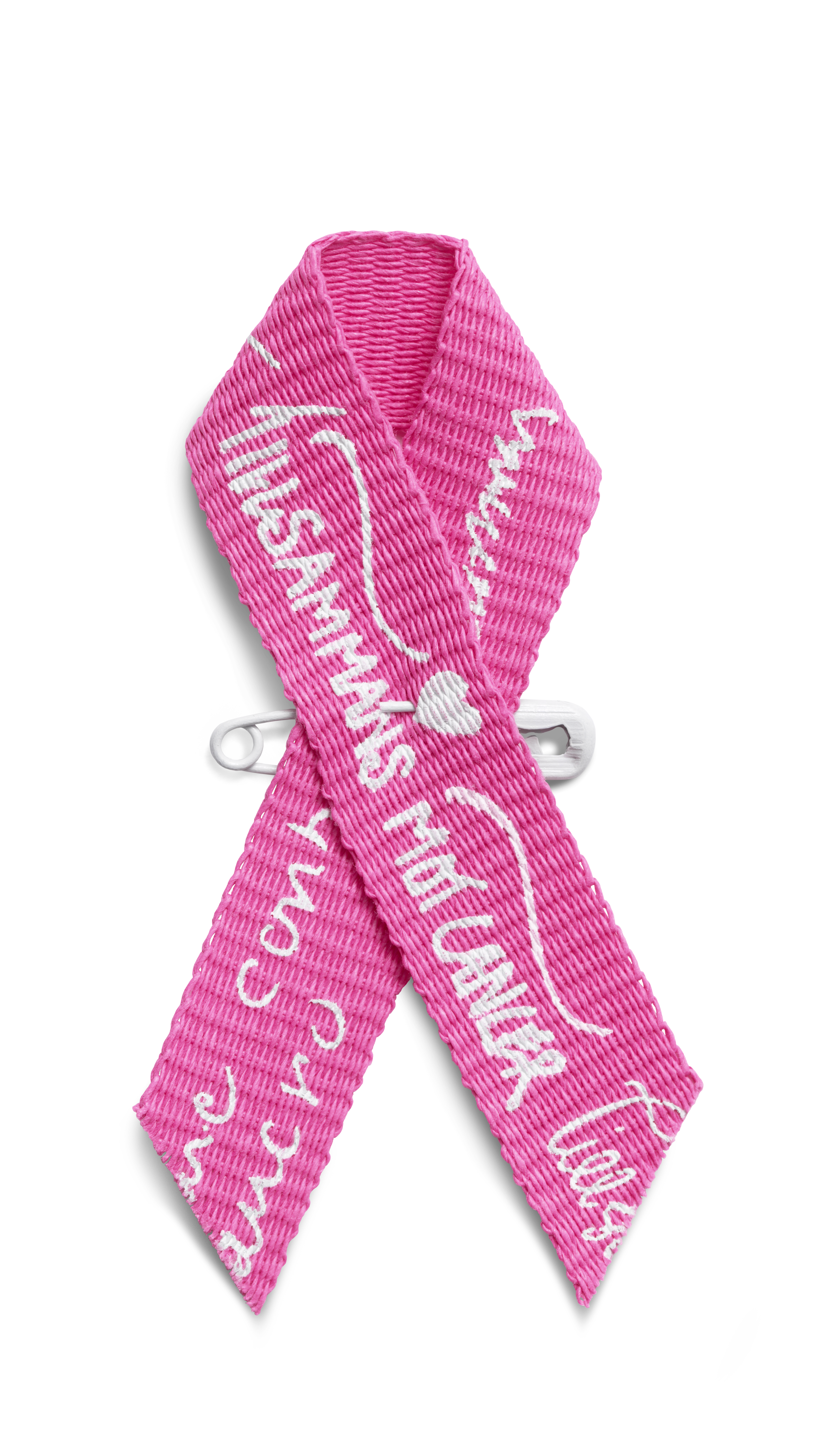 Årets 20 designers har fått skriva orden ”Tillsammans mot cancer” med sin handstil och den som köper Cancerfondens rosa band får ett unikt utsnitt av detta mönster.