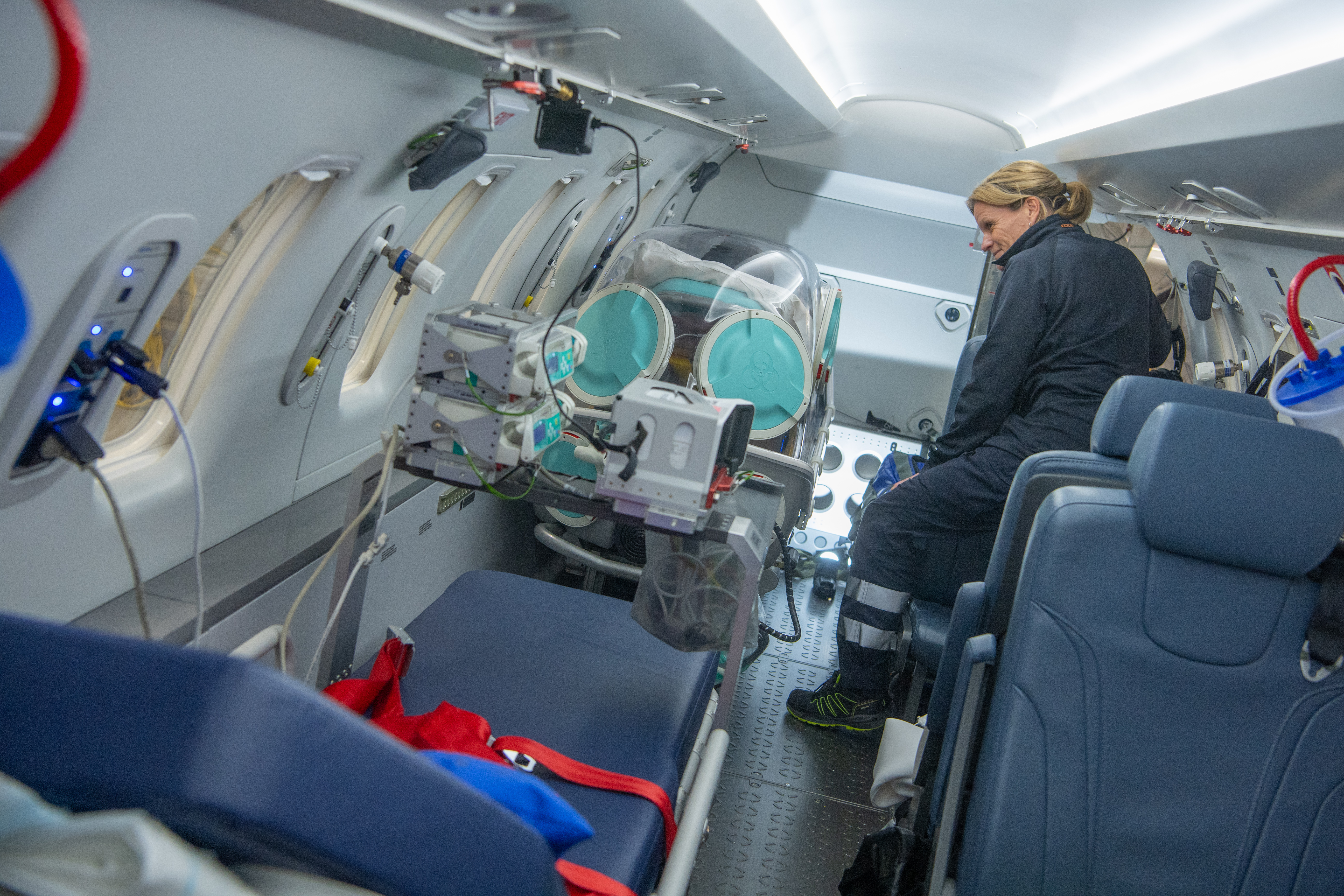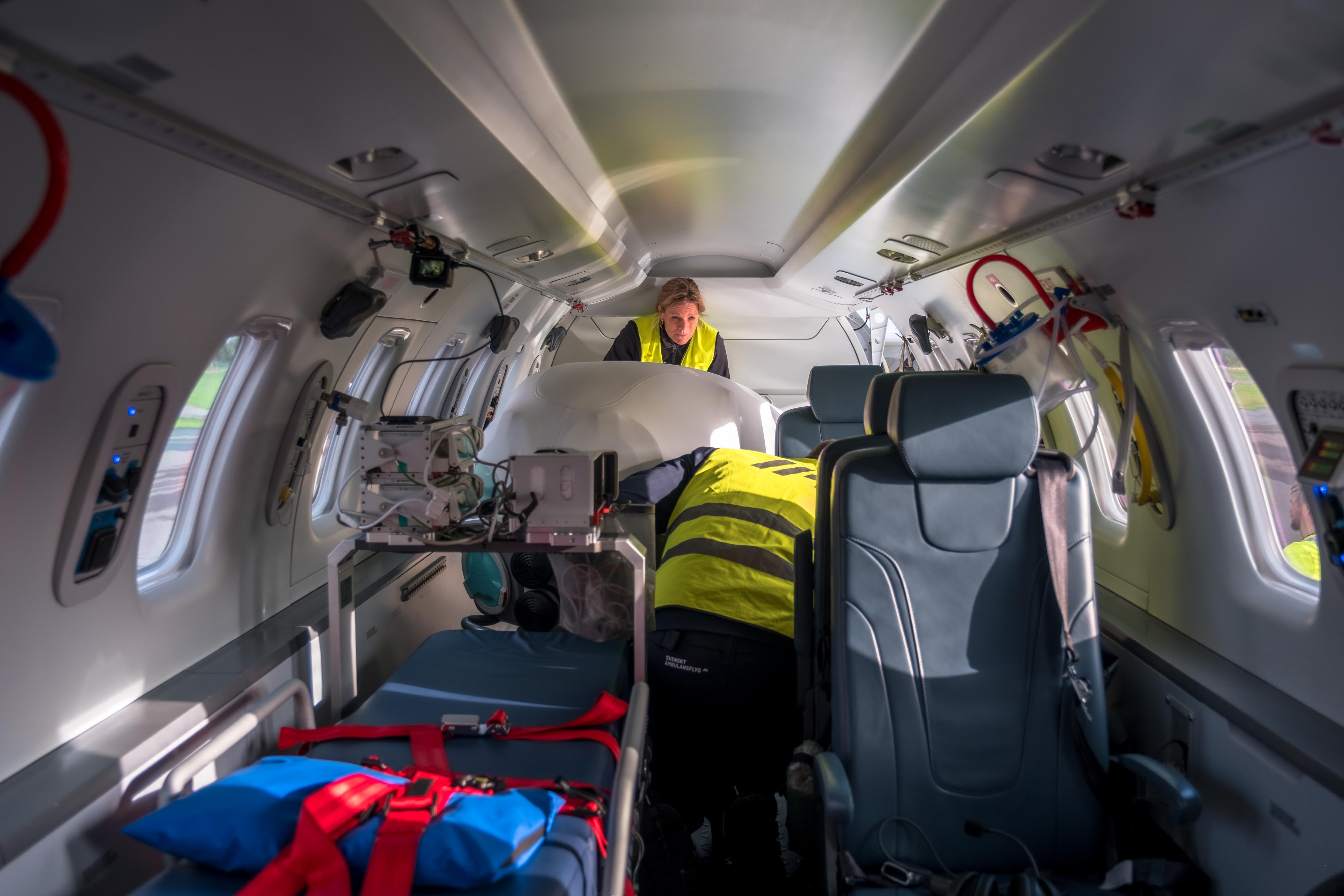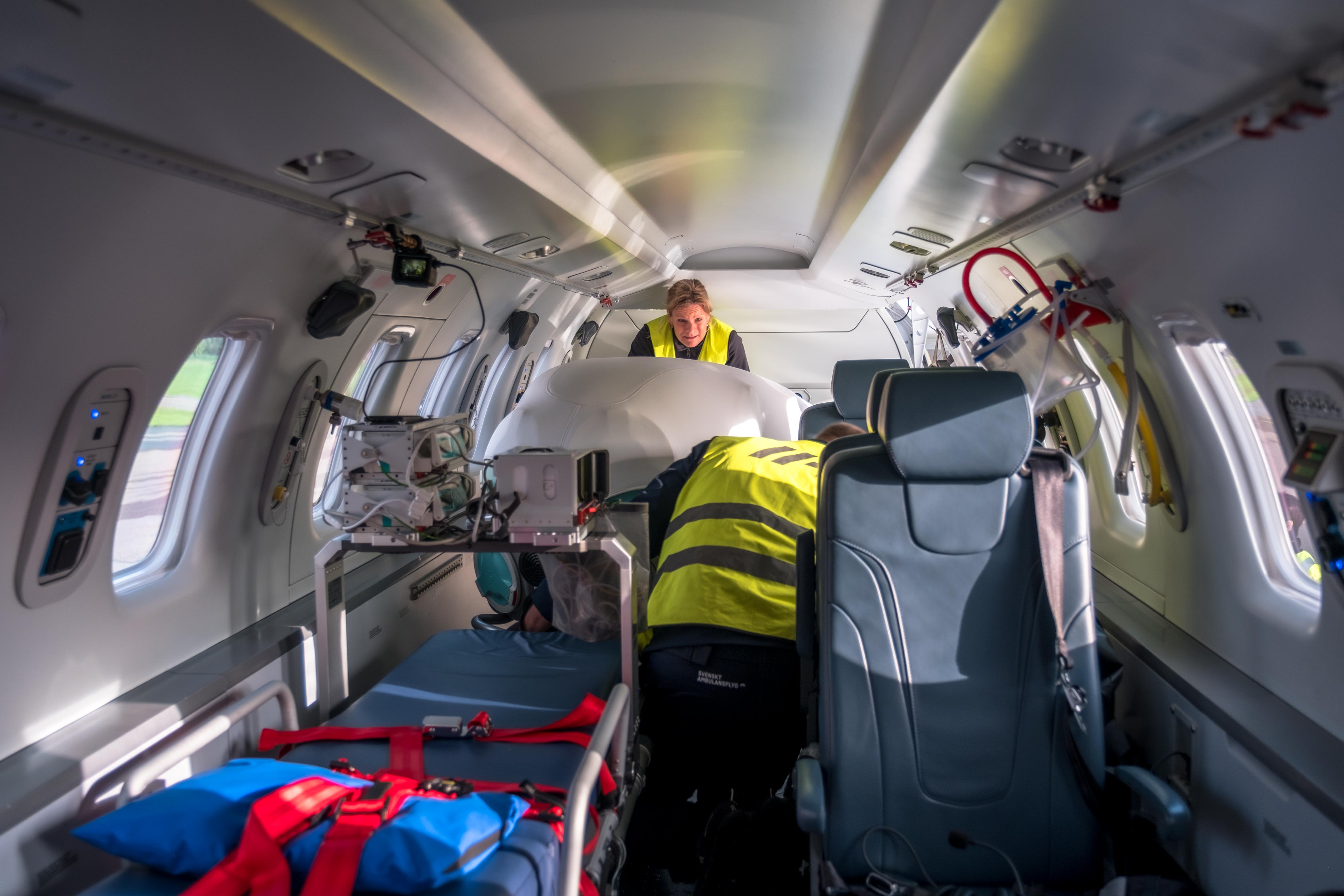 Ambulansflygplanen har en kabin utvecklad för att bedriva intensivvård och kan ta upp till tre patienter liggande på bår med en elektrisk bårlyft som bidrar till hög patientsäkerhet och god arbetsmiljö.