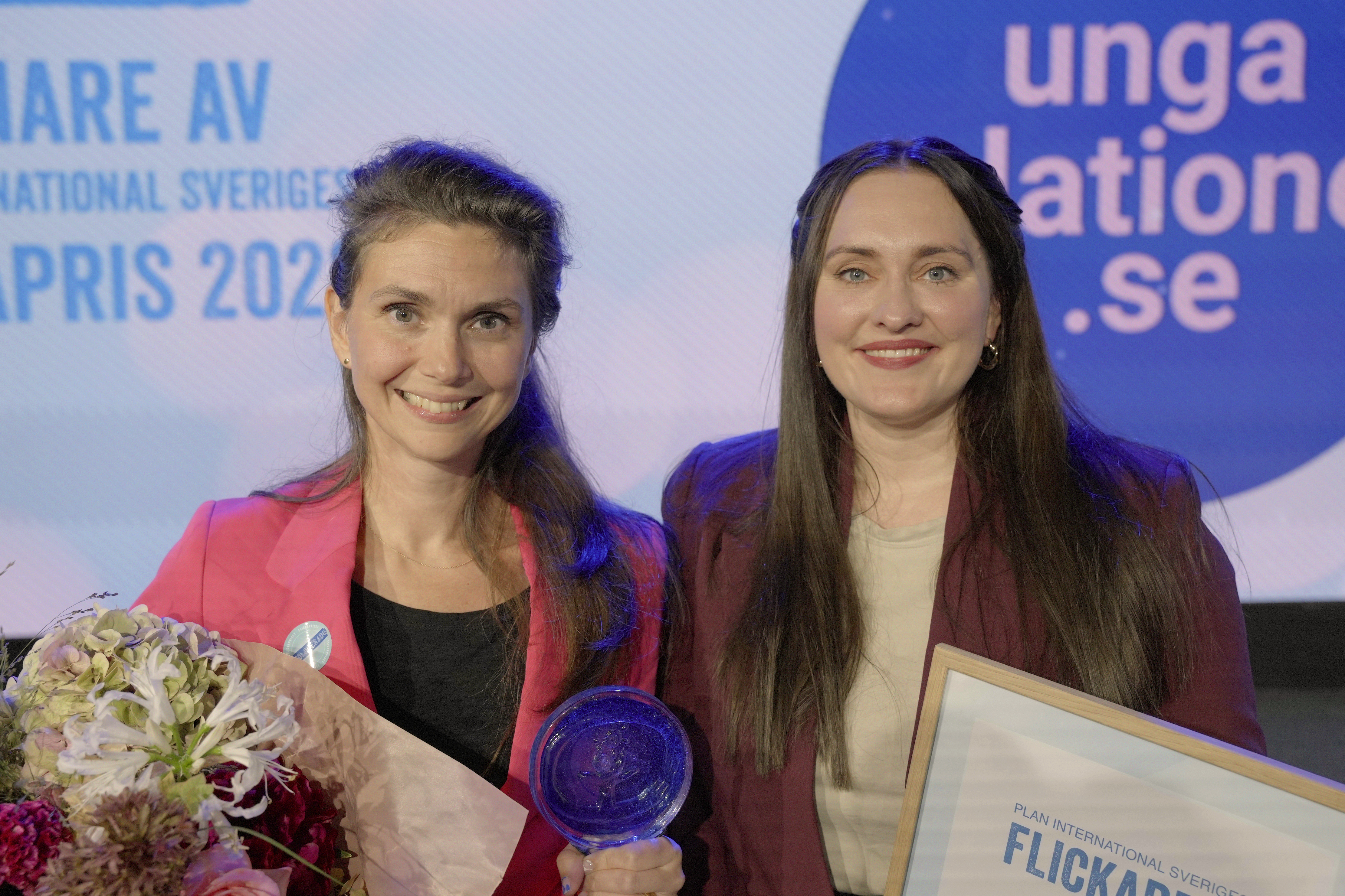 Zandra Kanakaris och Josefine Karlsson från ungarelationer.se som tar emot Plan International Sveriges Flickapris 2023.