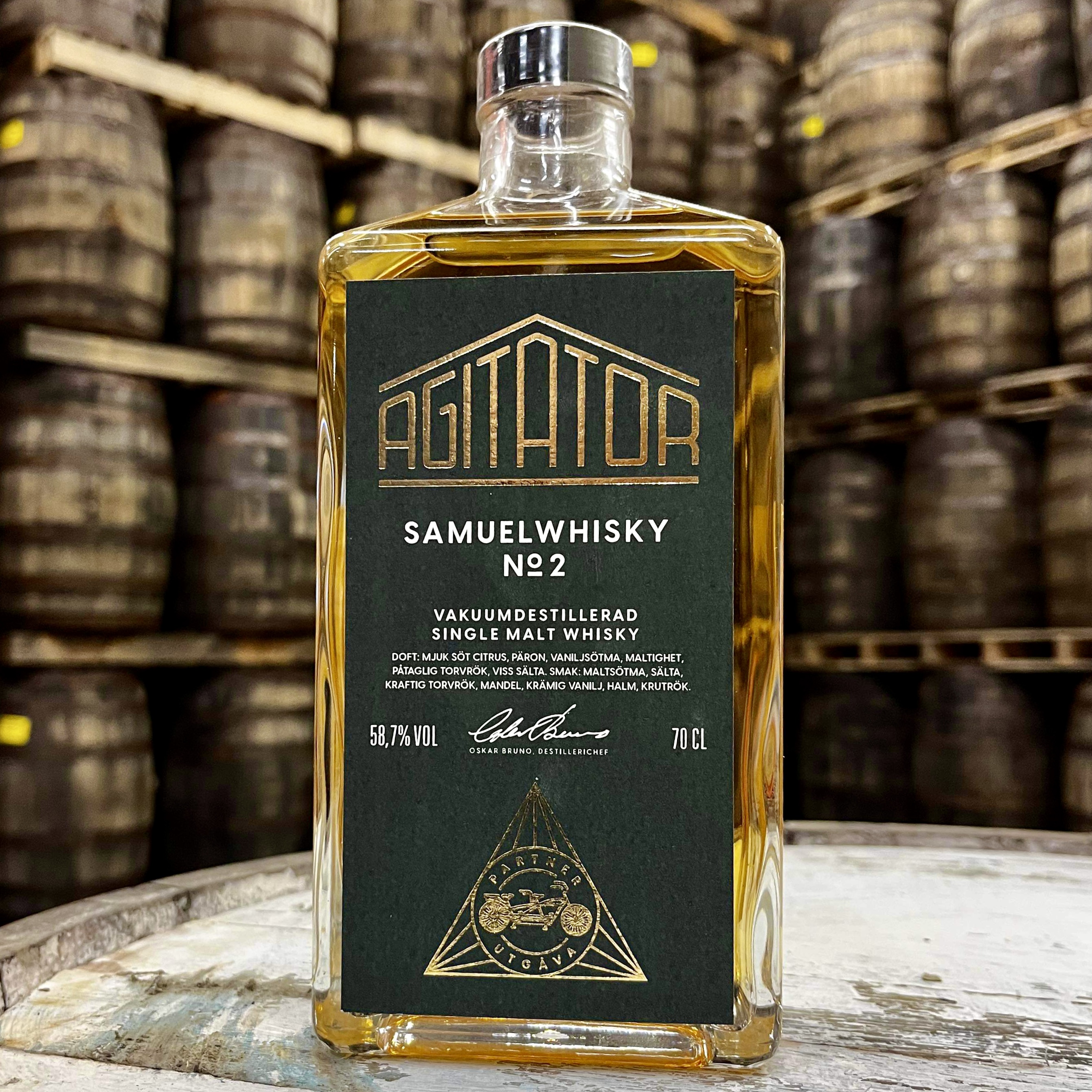SamuelWhisky No. 2 når hyllorna på Systembolaget den 16 oktober 2023. Precis som Agitators övriga sortiment, har SamuelWhisky no. 2 vakumdestillerats, något som ger en skonsammare behandling av råvarorna och därför en bättre sprit.