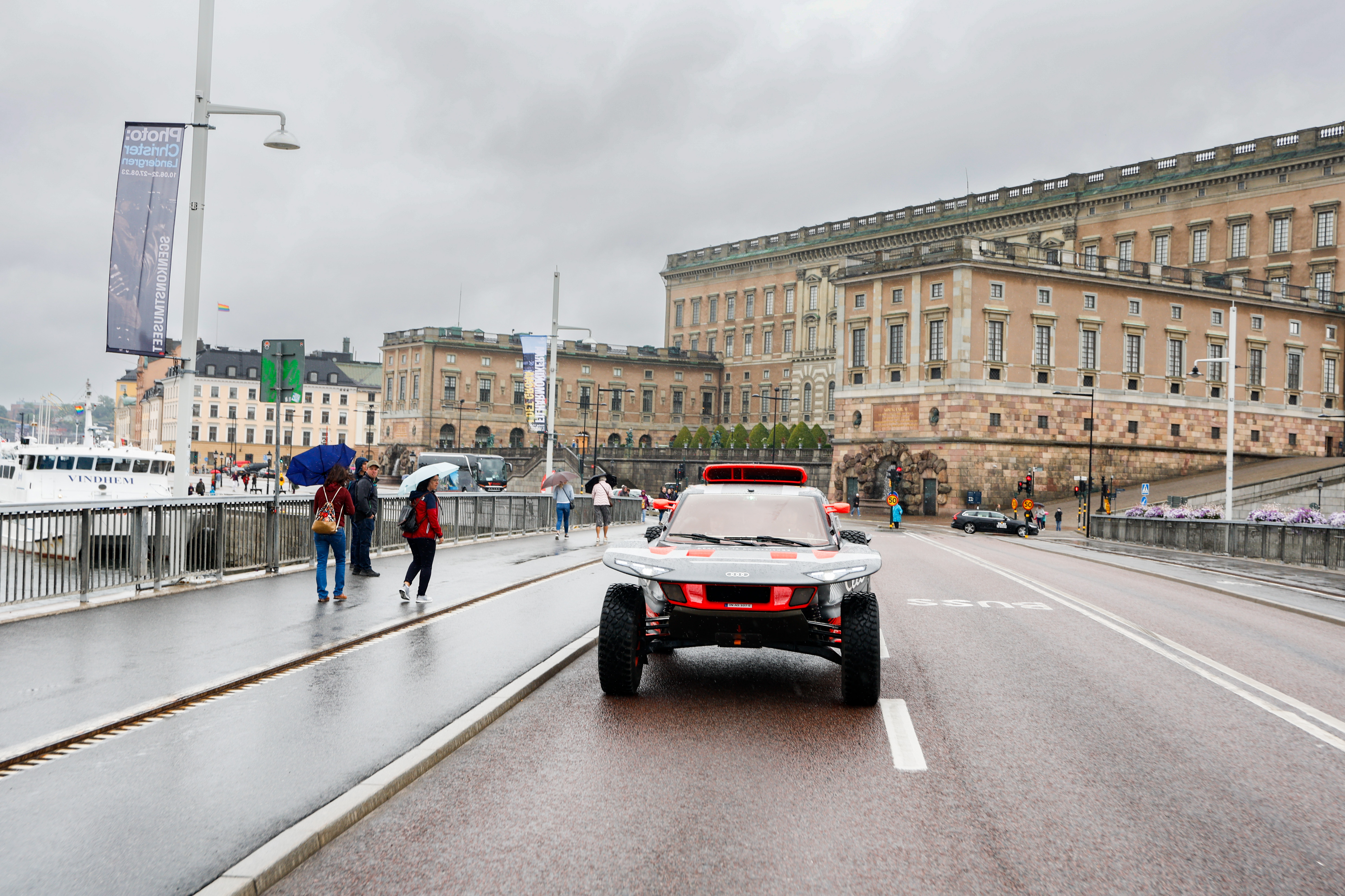 Mattias Ekström och Emil Bergkvist på oväntat besök i Stockholm med Dakarbilen Audi RS Q e-tron