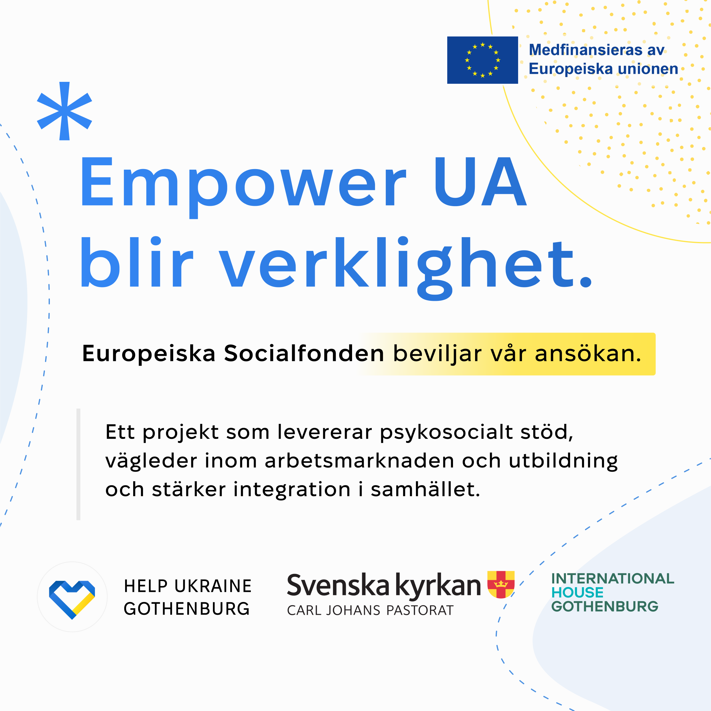 Help Ukraine Göteborg (HUG) och Carl Johans pastorat har beviljats finansiering för projektet "Empower UA" som syftar till att stötta ukrainska flyktingar i vägen till arbete, utbildning och egen försörjning, och öka det psykiska välmåendet i gruppen. Projektstödet kommer från ESF-rådet och startar omgående.