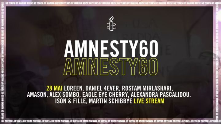 På fredag den 28 maj fyller Amnesty International 60 år som organisation och vårt arbete för en värld där varje människa åtnjuter sina mänskliga rättigheter. Detta firar vi med en livestream där bland andra Loreen, Martin Schibbye, Ison & Fille, Amason och Alexandra Pascalidou medverkar.