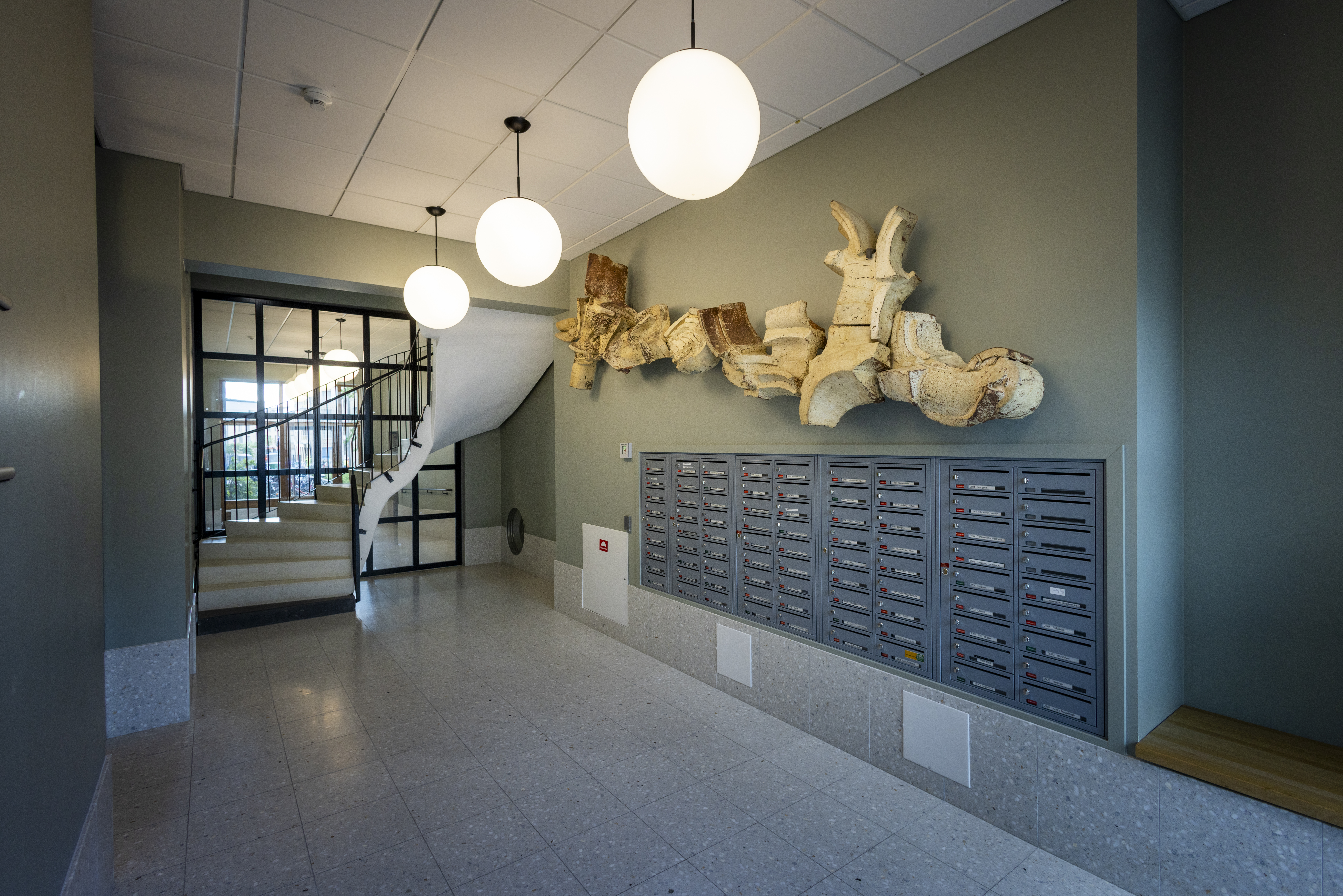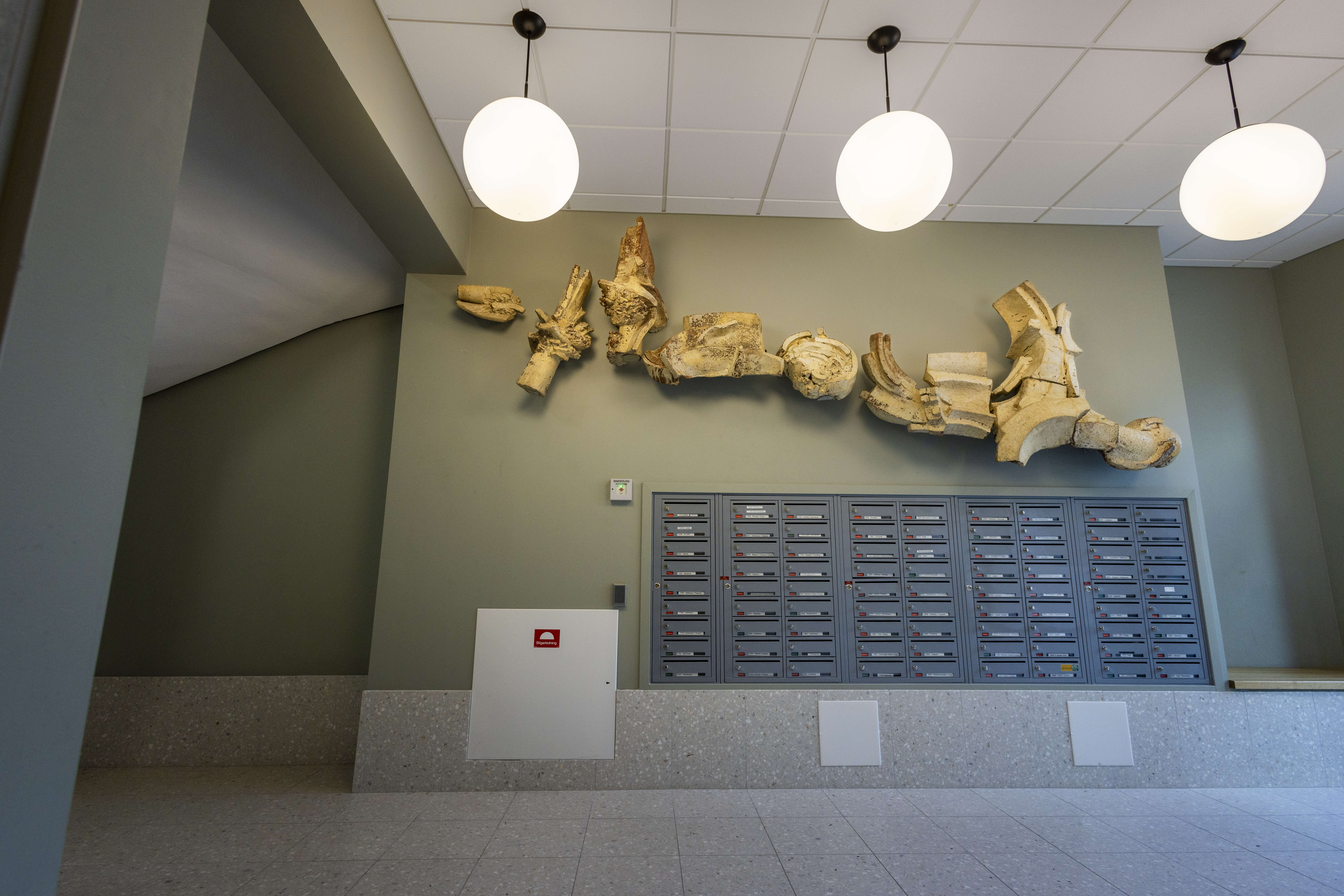 En konstinvigning planeras med både boende och Hertha Hillfons vänner under hösten. Även om trapphuset är låst för allmänheten så är det ändå möjligt att kika in genom porten för att se konstverket sväva ovanför postboxarna.