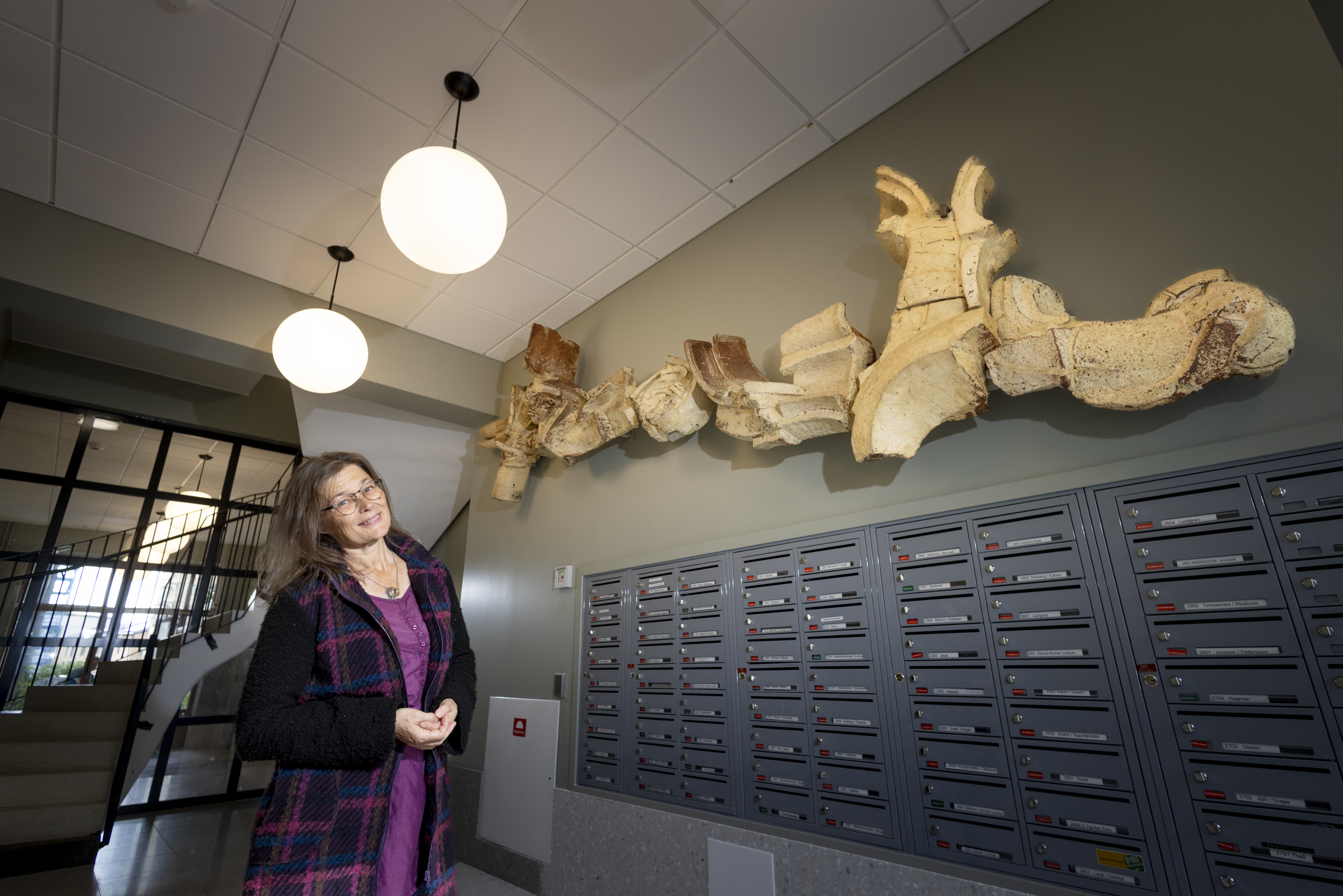 –Jag hade en bild på Hertha när hon arbetade med verket, men inte hur det såg ut när det var färdigt. Jag fick hjälp av ett par som dokumenterat en stor del av Hertha Hillfons offentliga verk runt om i landet. De hade bilderna på konstverket från Farsta sjukhus, men hade inte lyckats få fram uppgifter om var det fanns efter nedmonteringen. Därför är det så roligt att det nu sitter uppe i Älvsjö, säger Karin Rongedal.