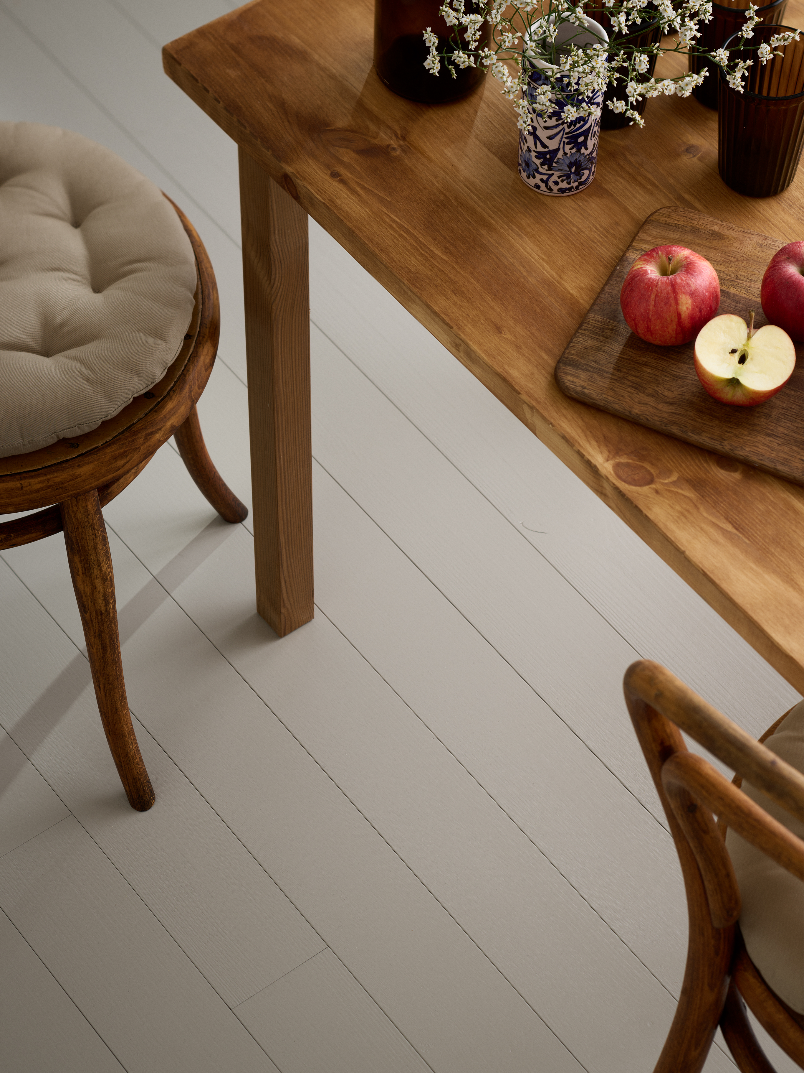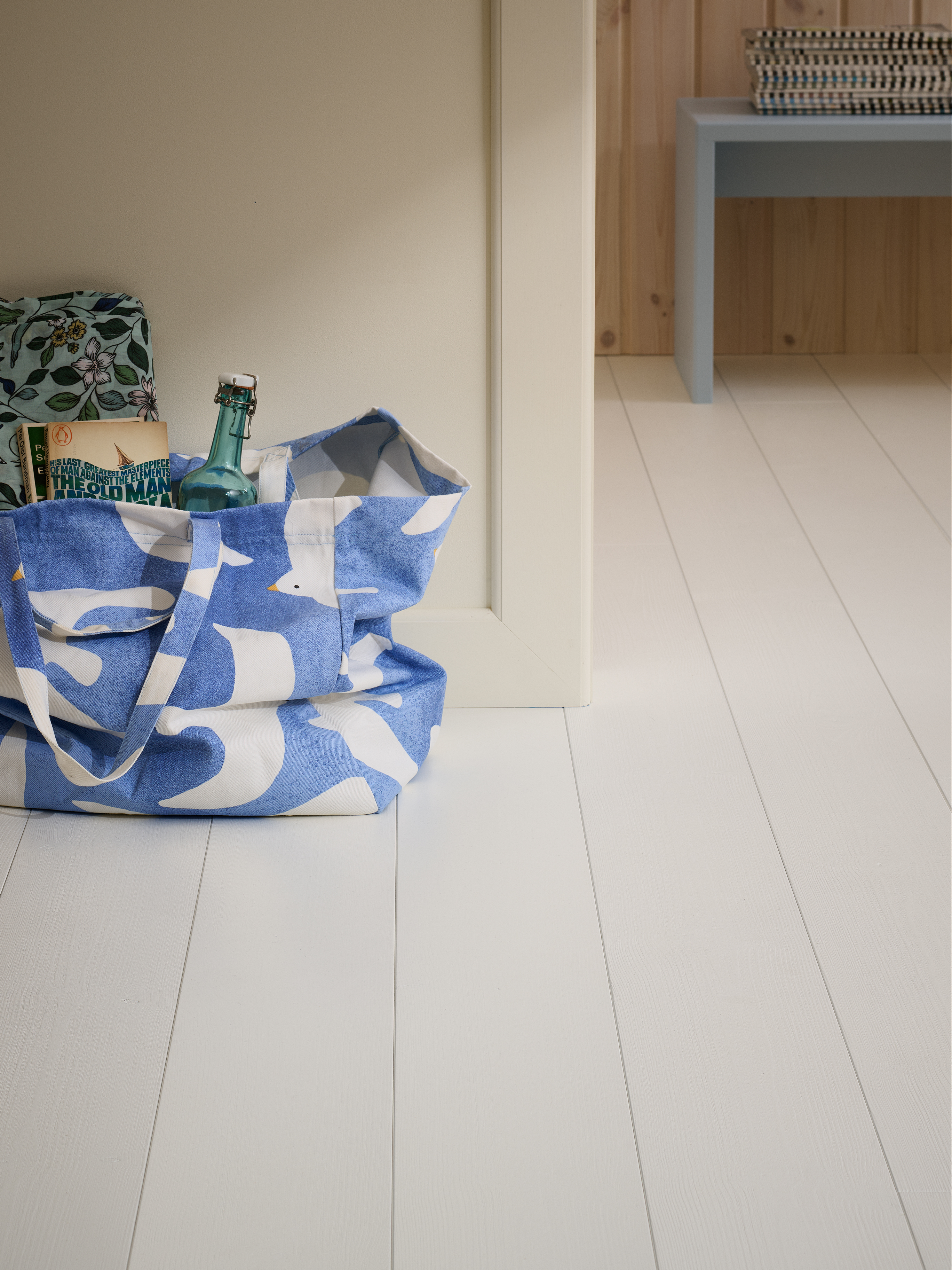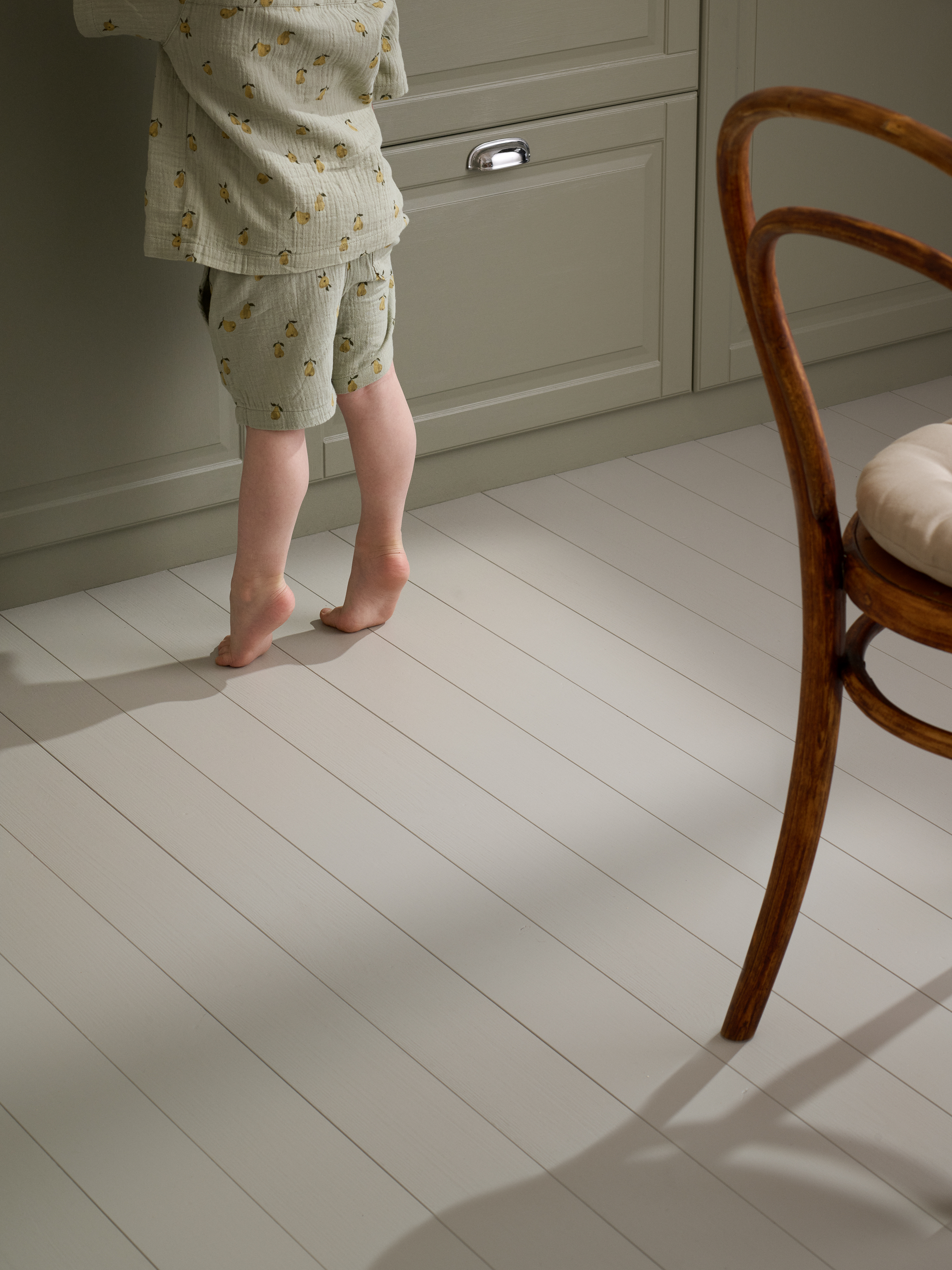 Golvet är omsorgsfullt borstat och målat så att trädstrukturen kommer till sin rätt. Med jordnära och milda färger som vit, beige och grå är Leva en bra bas till flera inredningsstilar.