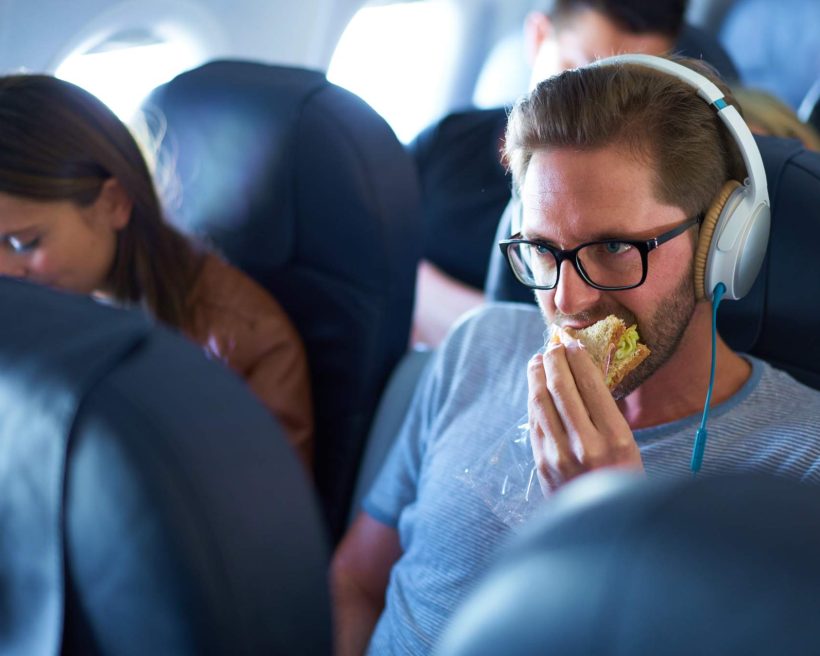 - Skippa tonfisk och ost som luktar fotsvett. Enligt undersökningen anser i princip alla att mat som luktar (94 procent) – inte minst ost (96 procent) – är en oacceptabel matsäck ombord på flyget. Andra livsmedel som många anser bör vara förbjudna är konserverad fisk (93 procent), mat som knastrar (91 procent) och hårdkokta ägg (78 procent).