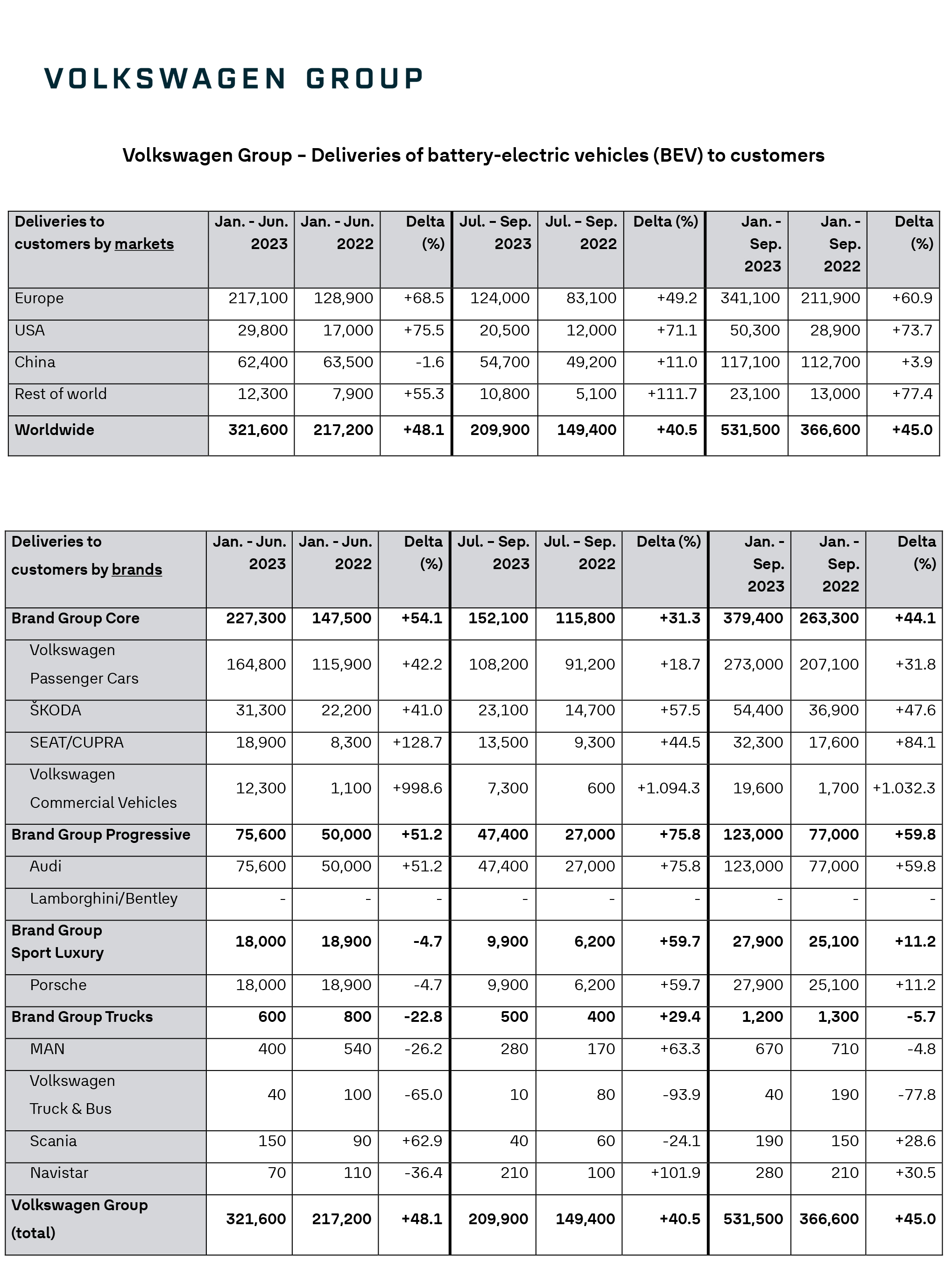 Volkswagen-koncernen har systematiskt fortsatt sin omställning under de första nio månaderna 2023. Leveranserna av elbilar ökade med 45 procent till 531 500 bilar globalt, vilket ökade andelen elbilar av de totala leveranserna till 7,9 procent jämfört med 6,1 procent samma period föregående år.